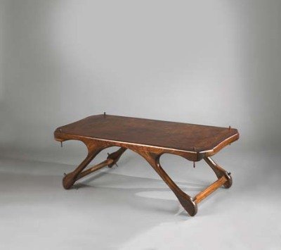 His pieces — lounge chairs, sling chairs, coffee tables, and case pieces — are distinguished by their generous proportions, visible joinery, and the use of richly grained tropical hardwoods, particularly cocobolo (as well as parota and rosewood).
