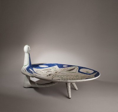 Drawn to the world of ceramics, Jean Derval learned his future craft in Saint-Amand-en-Puisaye. From mastering stoneware to glazing, Derval excelled both technically and aesthetically. In 1947, “les trois coqs” (Derval, Capron, Picault) reunited in Vallauris at the Callis workshop, which they had founded. Derval then left stoneware behind for earthenware and faience. In 1949, he took part in the Madoura workshop led by Pablo Picasso, before founding the Atelier du Portail in 1951.