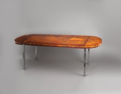 Marie-Claude de Fouquières (born 1937) is a French artist and designer active in the late 1960s and 1970s. She developed a distinctive body of work using polyester resin, creating sculptural furniture and objects characterized by deep, luminous, almost cosmic visual effects achieved through chemical reactions and successive polishing processes.