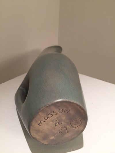 André Aleth-Masson, né en 1919 à Rennes et décédé en 2009, est un artiste français aux multiples facettes : céramiste, sculpteur, peintre et graveur. Après des études à l’École des Beaux-Arts de Rennes, puis à celle de Paris, il se perfectionne dans l’art de la céramique en 1947 à l’École de céramique de Fontcarrade, près de Montpellier. Il s’installe à Paris au début des années 1950, où il entame une carrière artistique marquée par plusieurs expositions personnelles, notamment à la galerie MAI en 1952, 1955 et 1961. Dès 1952, il devient un membre actif de la Société des Artistes Décorateurs, participant régulièrement aux salons et s’imposant comme l’une des figures du renouveau de la céramique en France. Dans les années 1960-1970, il réalise des œuvres monumentales dans le cadre des commandes publiques du 1% artistique et s’illustre au sein du mouvement du « Mur vivant », qui explore la céramique à grande échelle et l’intégration de l’art dans l’architecture. Au fil des décennies, il élargit son champ artistique, se consacrant dans les années 1980 à la peinture et au travail du bois découpé peint. Dès les années 1990, il se tourne vers la gravure et la peinture acrylique sur toile, dévoilant un univers coloré et poétique. L’œuvre d’André Aleth-Masson, à la croisée de l’art et de l’artisanat, est aujourd’hui saluée pour son inventivité, sa modernité et sa contribution essentielle à l’histoire des arts décoratifs du XXe siècle.