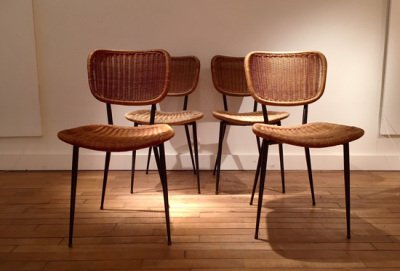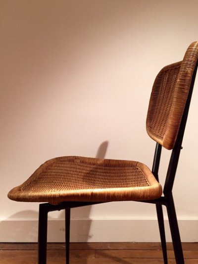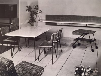 Décoratifs en 1955, dans les Ateliers de Jacques Dumond. De leur union privée et professionnelle naissent des pièces incarnant l’esprit moderne. Au début des années 50, Janine Abraham étudie à l’école des Beaux Arts puis à l’école Camondo. Elle s’inscrit alors dans le sillage des grands noms du design français à l’instar de Pierre Paulin, lui même issu de cette école. Ces créateurs partagent une certaine idée du goût ; l’élégance de la conception. Dirk Jan, quant à lui, se familiarise avec les techniques de fabrication de meubles dans le Faubourg Saint Antoine avant de prendre des cours aux Arts Décoratifs. Le couple crée leur agence en 1957. Son activité est double : une partie est consacrée à la création de modèles pour la production en série, tandis qu’une autre partie est dédiée à l’architecture d’intérieur pour une clientèle d’industriels ou commerçants. Ce « décorateur à deux têtes »¹ révèle une homogénéité de création incroyable. Tandis que Dirk Jan Rol se concentre sur le côté structurel et architectural, Janine Abraham laisse libre cours à son imagination et rivalise de fantaisie décorative. Oscillant entre rigueur de conception et souplesse de dessin leurs créations n’auront de cesse d’être primées. C’est ainsi que seulement un an après leur première exposition au Salon des Artistes Décorateurs en 1956, ils reçoivent la médaille d’argent de la Triennale de Milan pour une chauffeuse au savant pliage d’aluminium. Leurs créations en rotin, reminiscence d’une tradition artisanale, synthétisent l’essence même deleur esprit : aux volumes extravagants contrastent la pureté des structures métalliques.