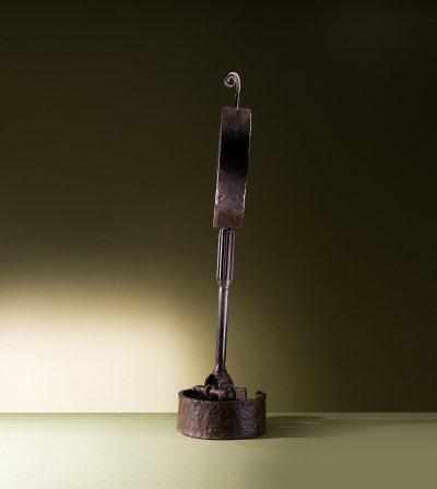 Parallèlement à son activité de galeriste, Léopold Gest développe une œuvre personnelle qui prend forme à la fin des années 1960. Il commence alors à créer ses premiers objets en métal à partir de fragments glanés dans le monde rural : morceaux de charrues, mors de chevaux, bêches et outils agricoles abandonnés. Ces éléments, découpés, recomposés et abrasés selon son intuition, deviennent lampes, bougeoirs, miroirs ou sculptures. Parfois évocations animales, parfois machines imaginaires, ces assemblages proches de l’esprit du ready-made marquent le début d’une recherche où l’acier devient son matériau de prédilection.