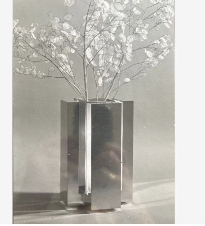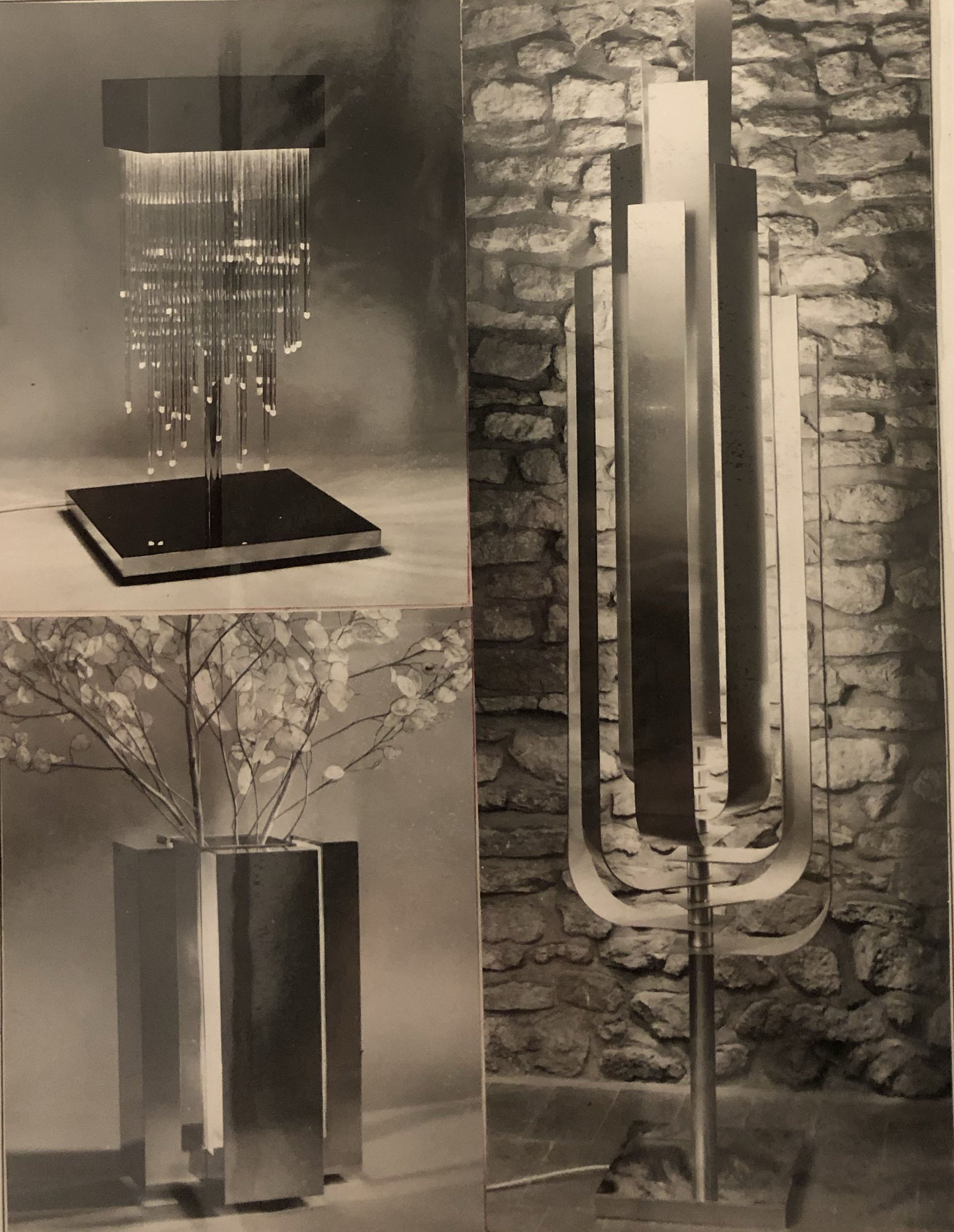 Laiton poli, plexiglas diffusant. Composé de quatre luminaires entourant un vase.