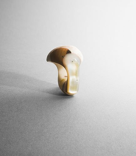 Dent de mammouth, os, bois de gaïac avec aubier, nacre, laiton, plexiglas.