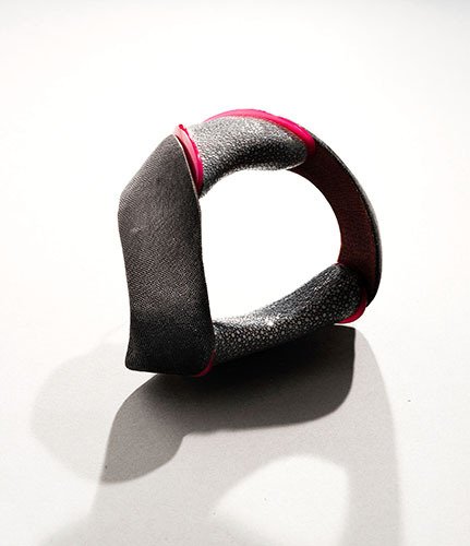 Cuir, galuchat de raie et de requin, nacre, plexiglas, laiton, bambou.