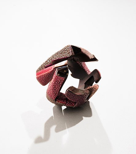 Cuir, galuchat de raie et de roussette, nacre laiton.