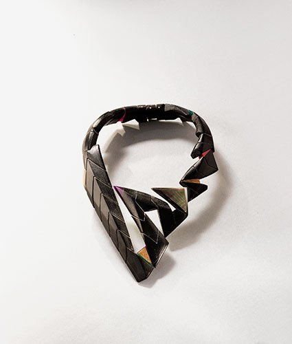 Cuir, cuivre tressé, plexiglas, nacre, cuivre, corne, maillechort, érable teint, laiton.