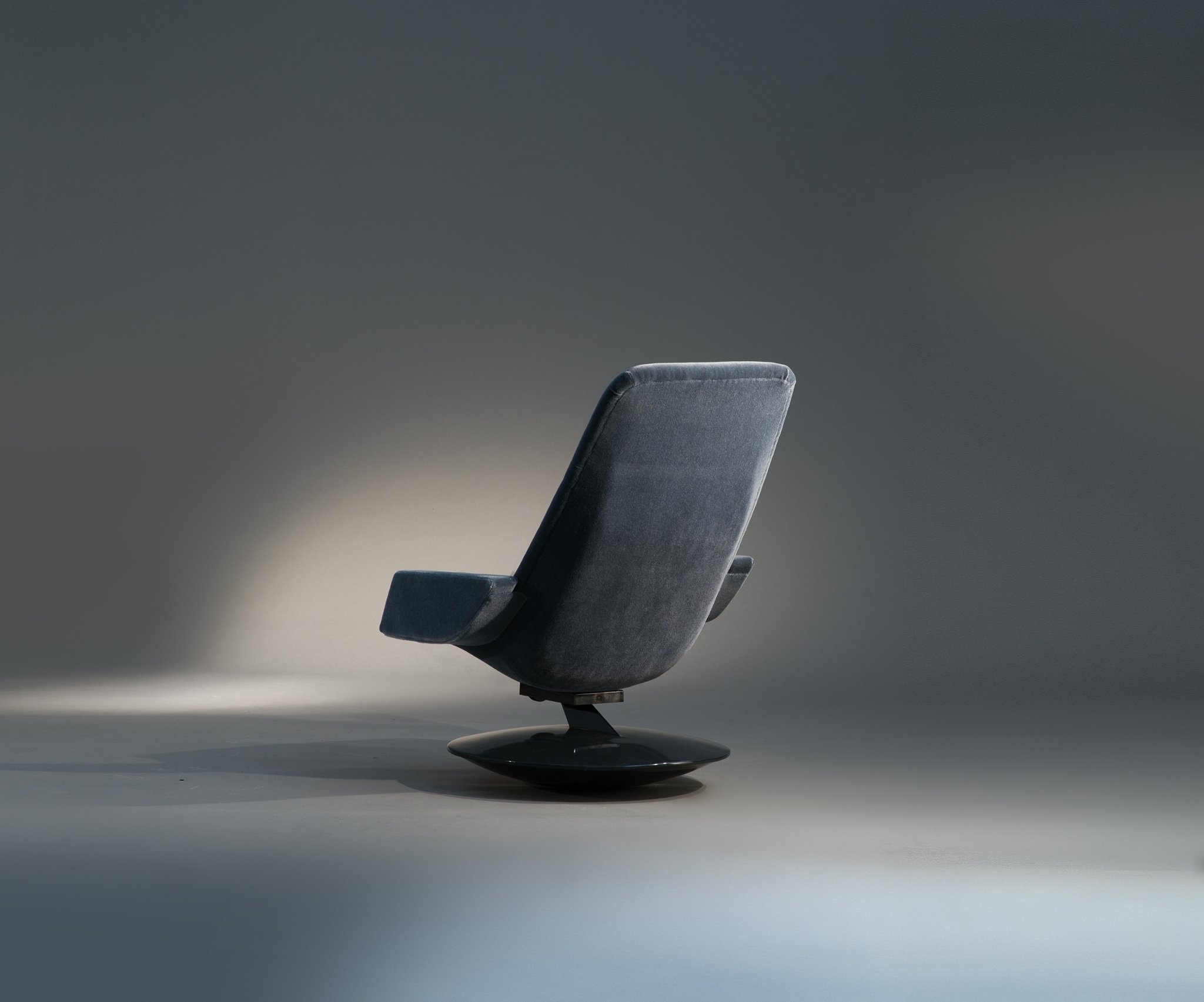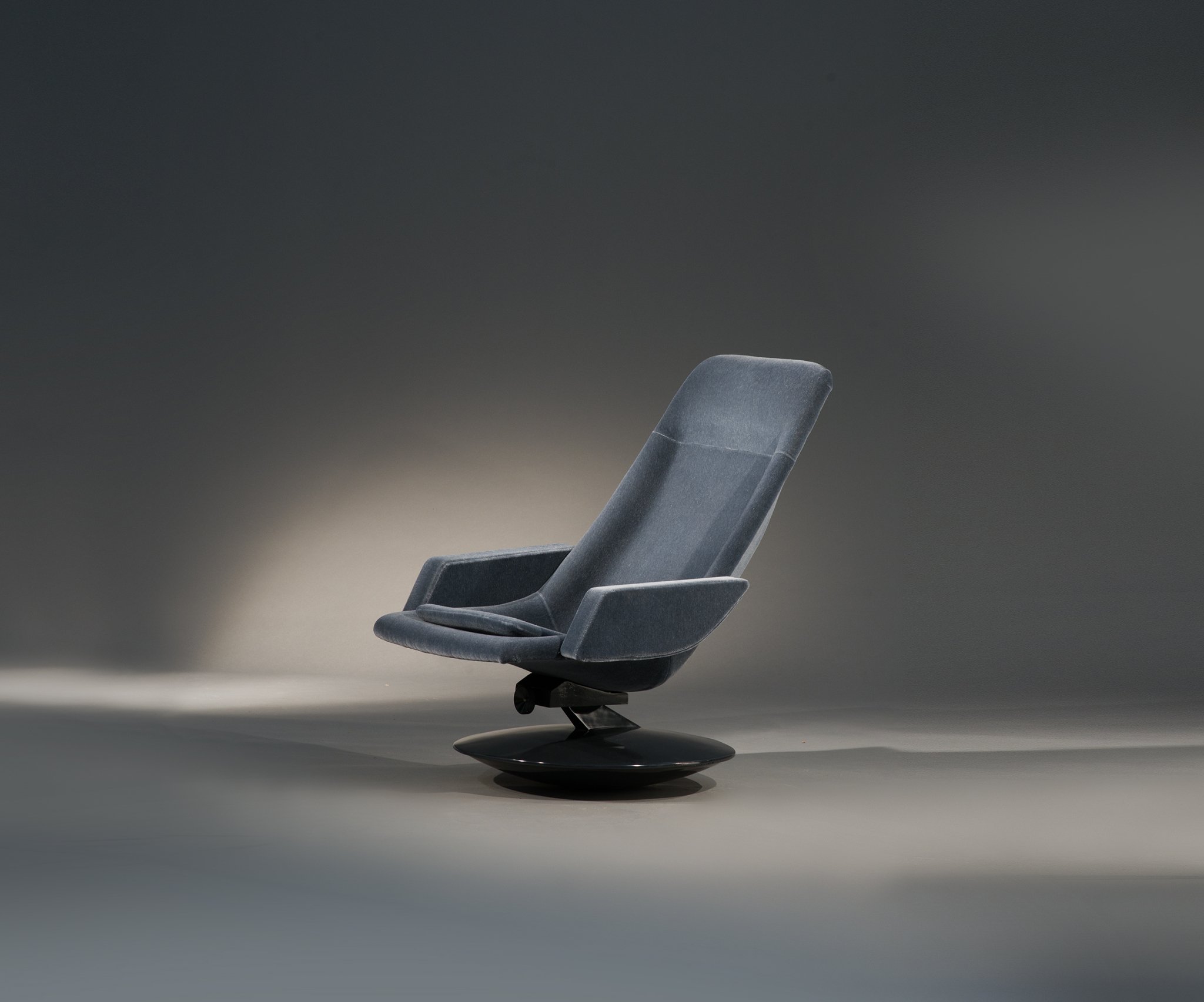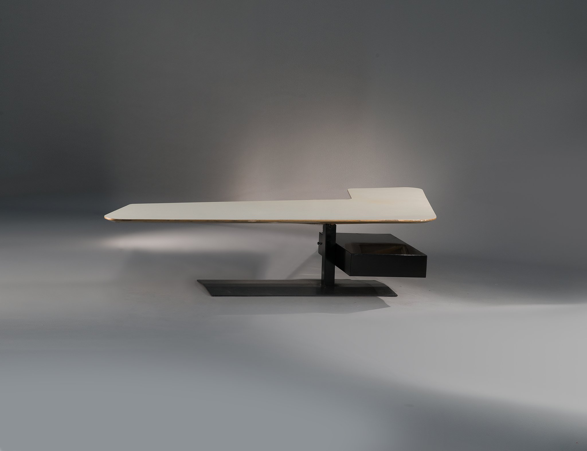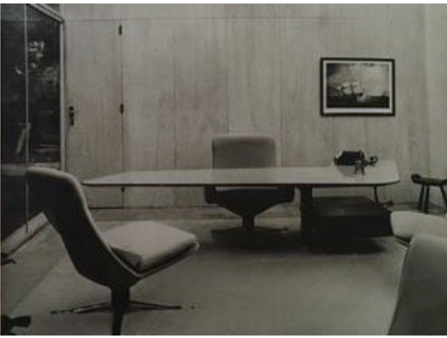 Composé d'un grand bureau 'boomerang' pivotant et de 3 fauteuils 'culbutos'.