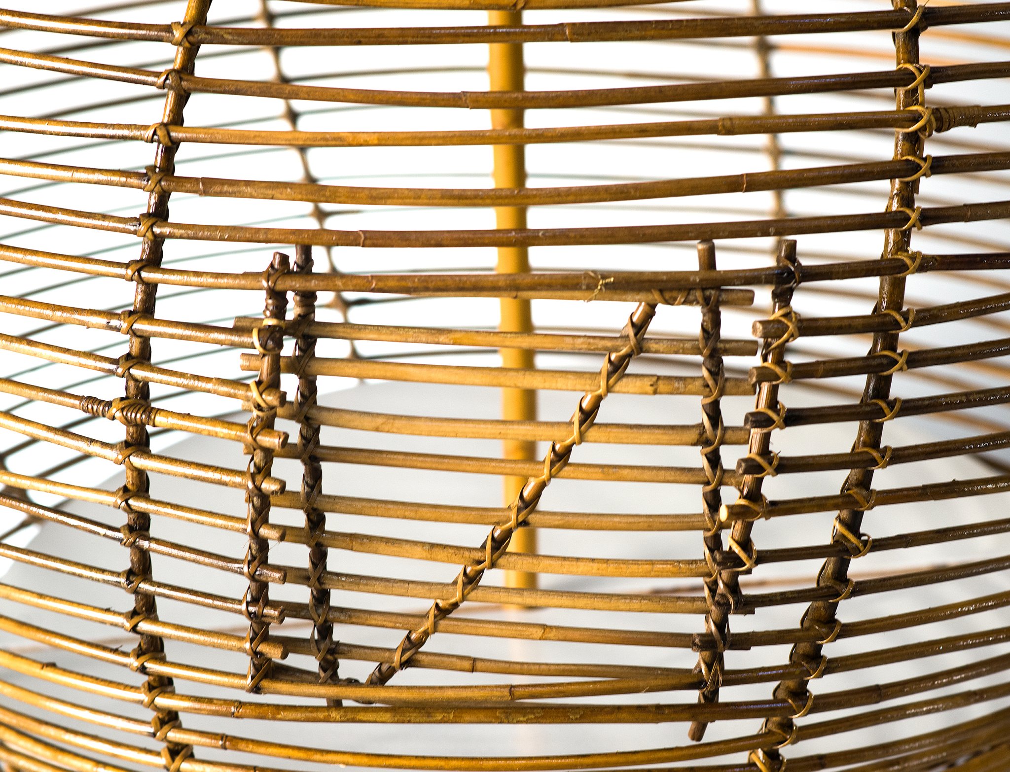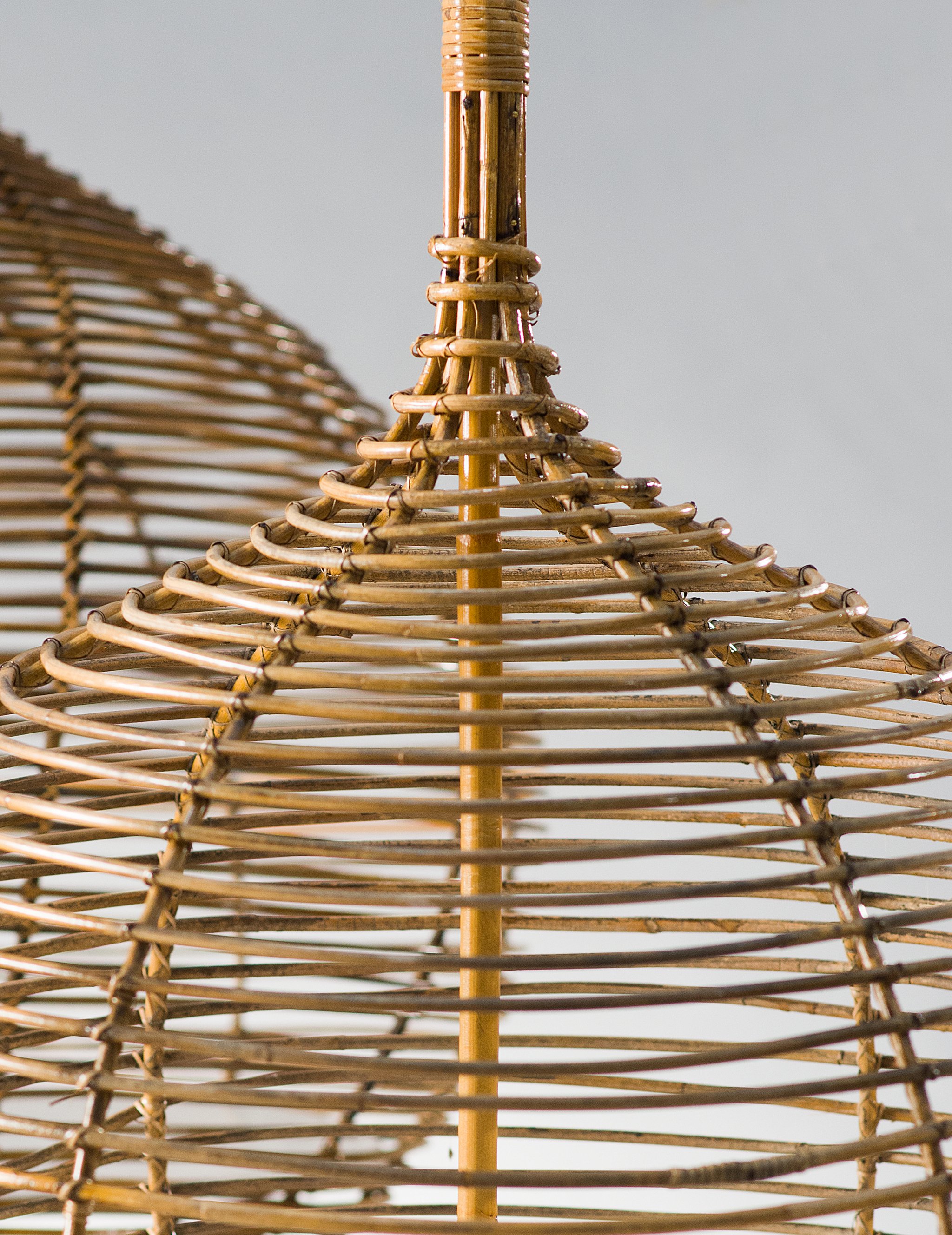 Cet ensemble unique de trois cages sphériques en osier provenant de la maison-atelier de Janine Abraham et Dirk Jan Rol, édifiée entre 1968 et 1970 au 34 bis avenue du Château à Meudon. Cette demeure, conçue comme un manifeste de leur vision du design et de l’habitat, associait architecture, mobilier et éléments décoratifs dans une continuité inventive. Les cages, suspendues à l’étage, formaient une cloison légère entre le salon et la salle à manger : à la fois séparateurs d’espace, objets décoratifs et sculptures ajourées, elles illustraient l’attention du couple à la lumière, à la fluidité des volumes et à l’équilibre entre fonction et poésie.