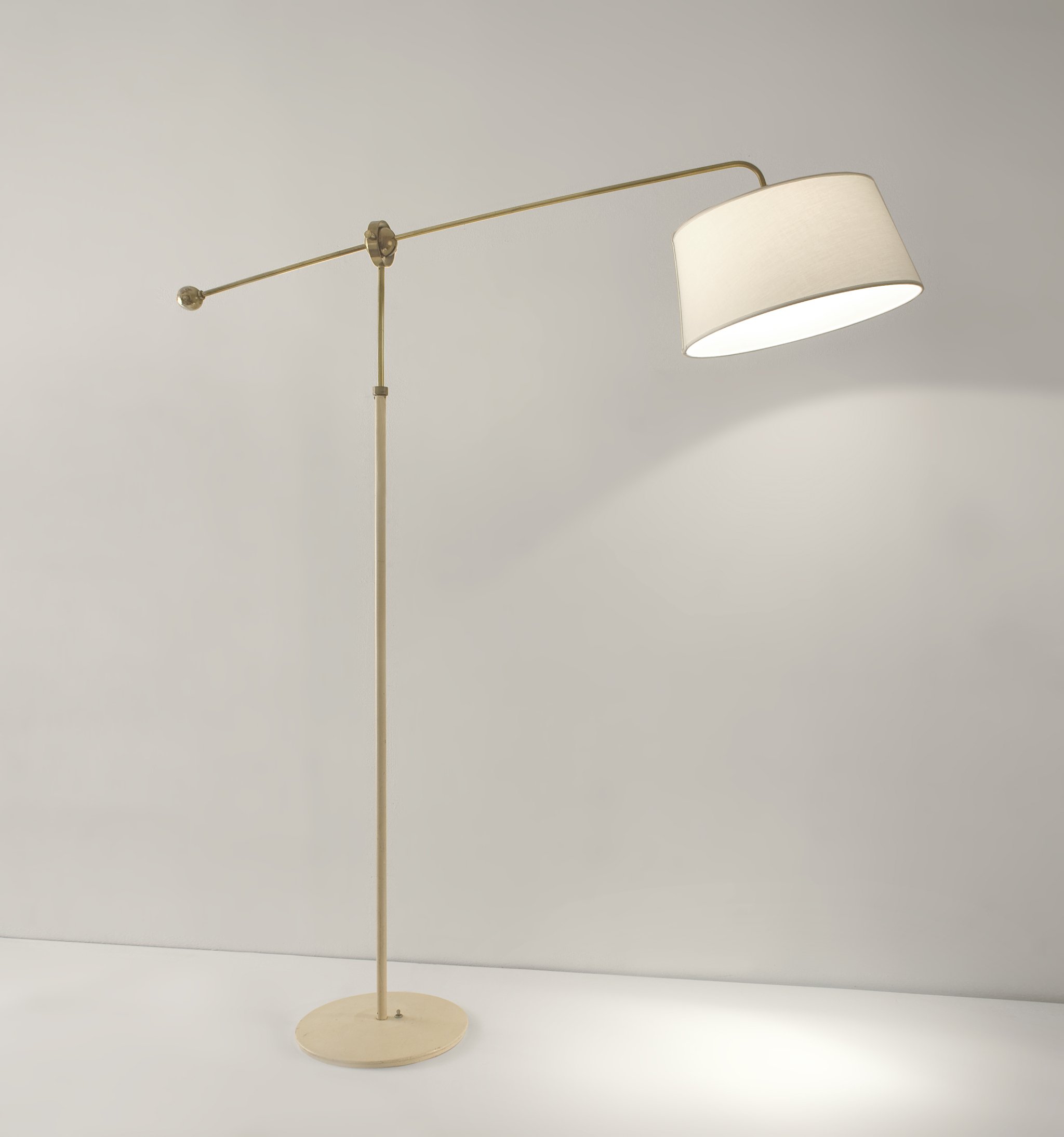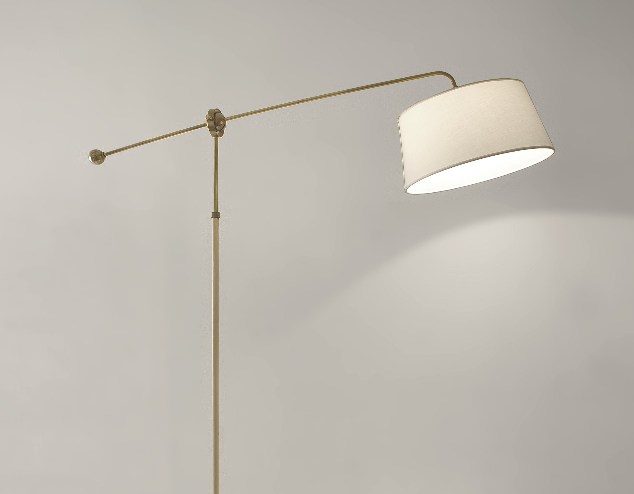 Lampadaire télescopique, rotule et contrepoids en laiton, avec abat-jour tissu.