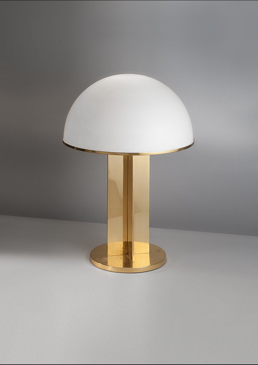Lampe de Michel Boyer.Laiton et verre opalin.Édition Verre Lumière, France, circa 1970.H. 60 cm, Dia. 40 cm.