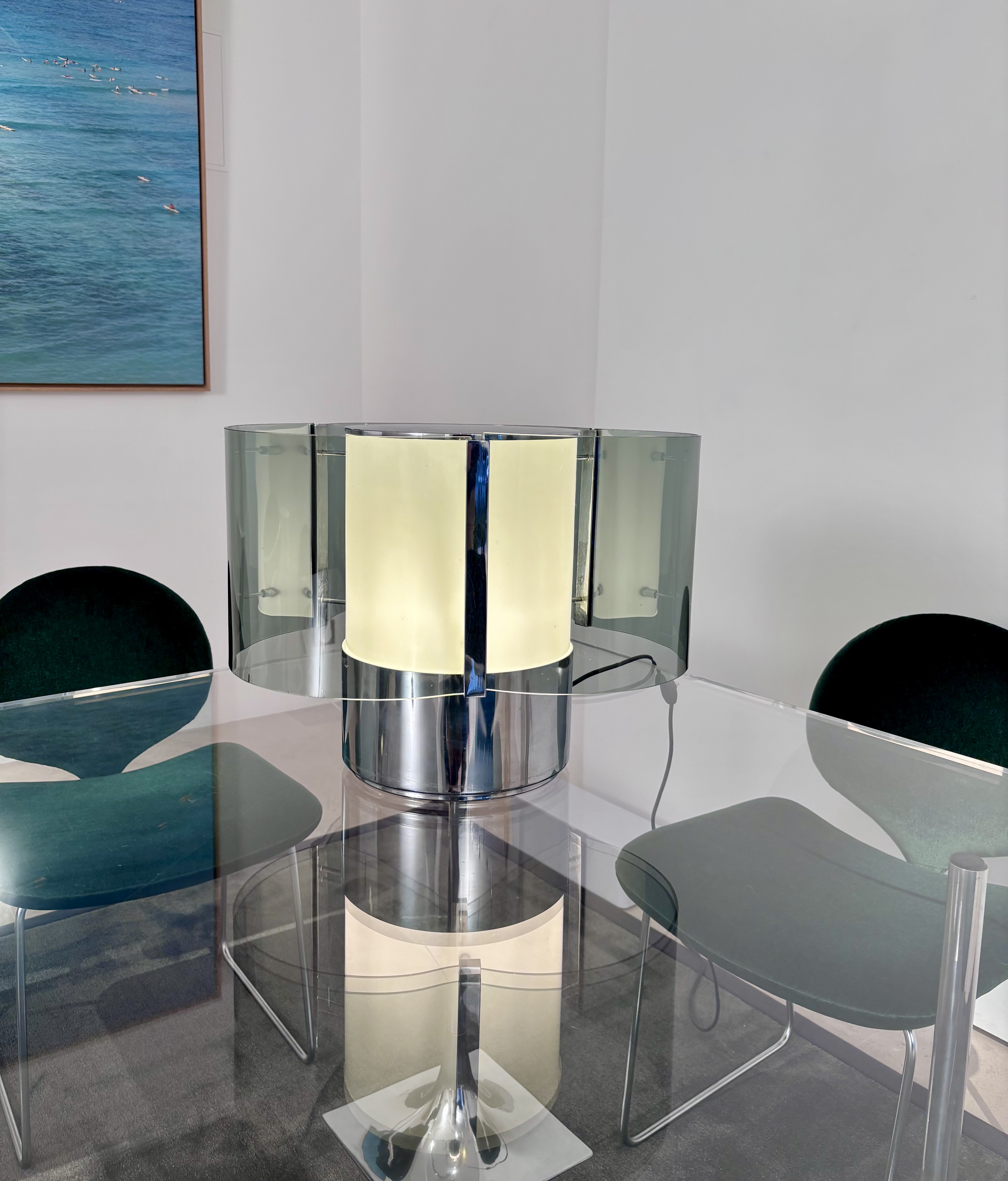 Fibre de verre, verre opalin et laiton chromé.