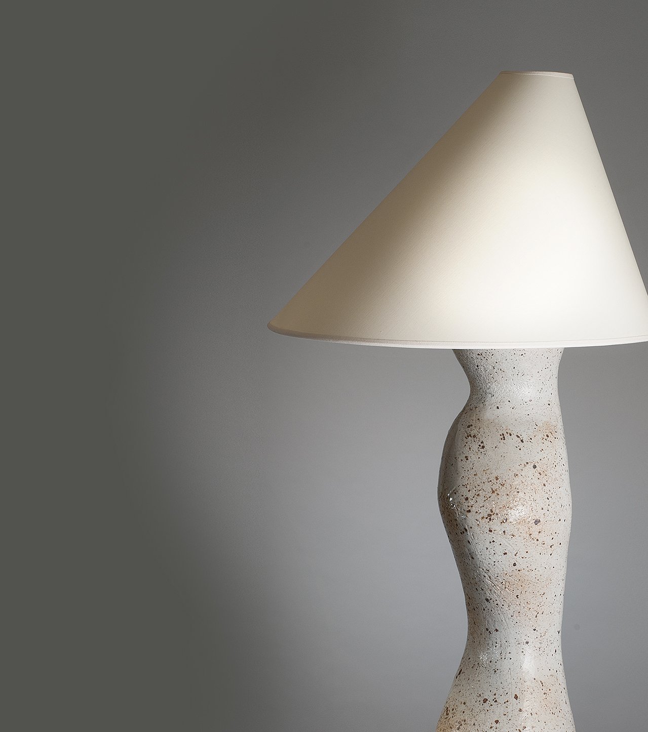H. totale céramique 74 cm, diam. céramique 18 cm Abat jour réglable en hauteur ; dimensions abat-jour : l. 55, l.38. H. 36 cm