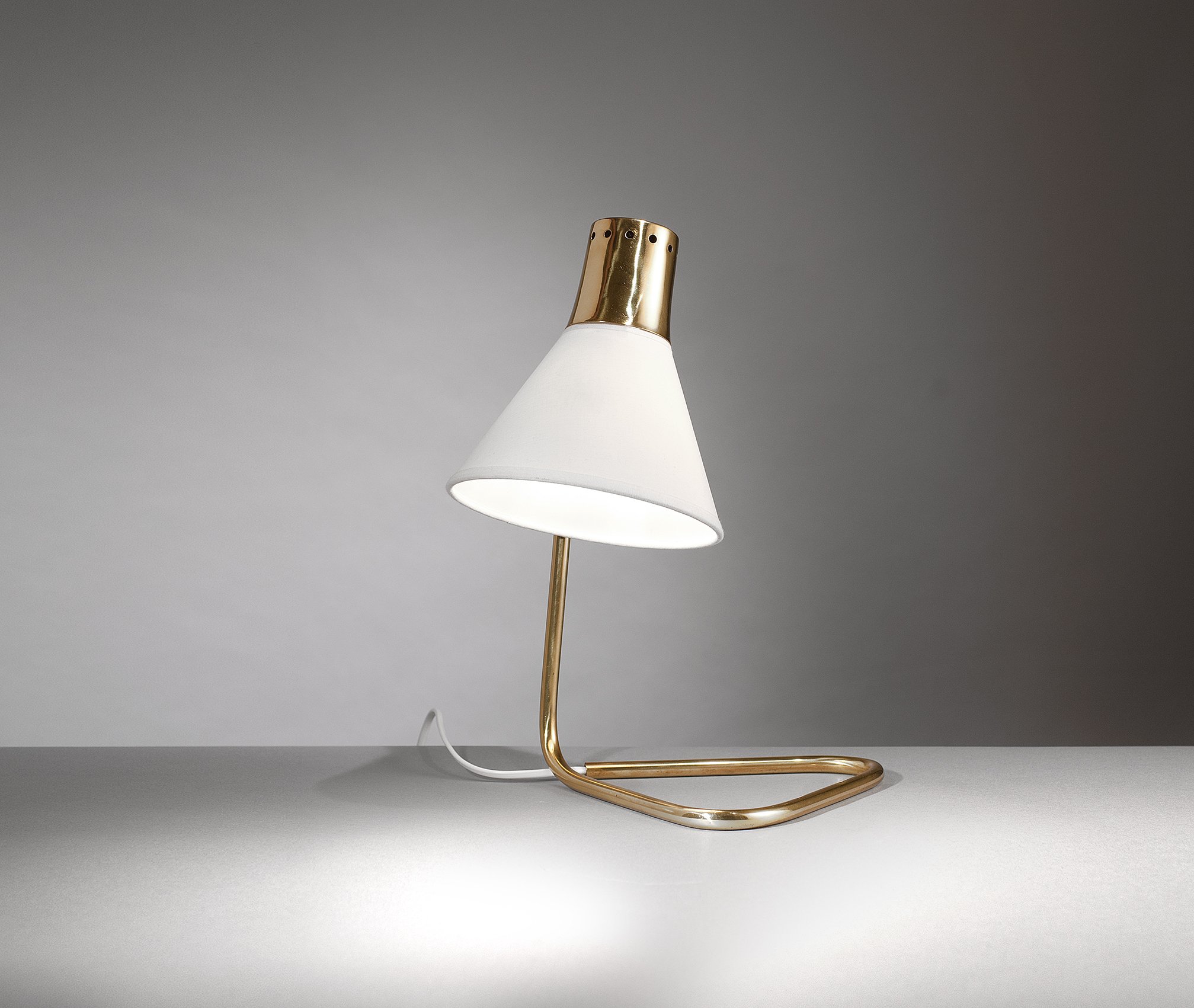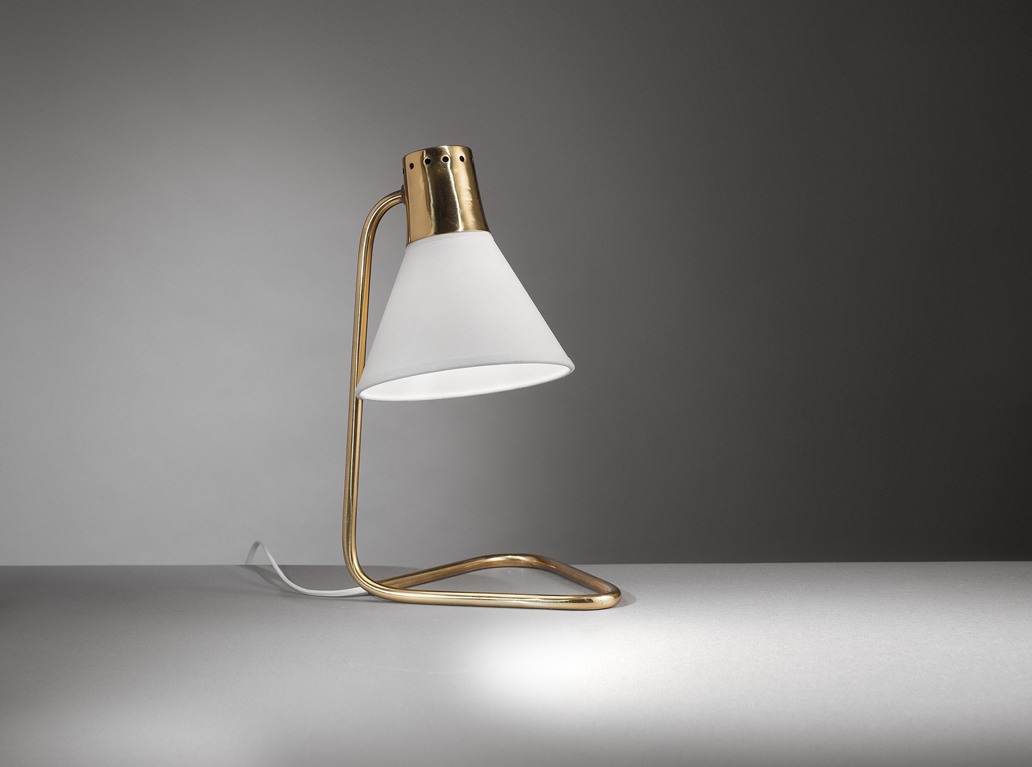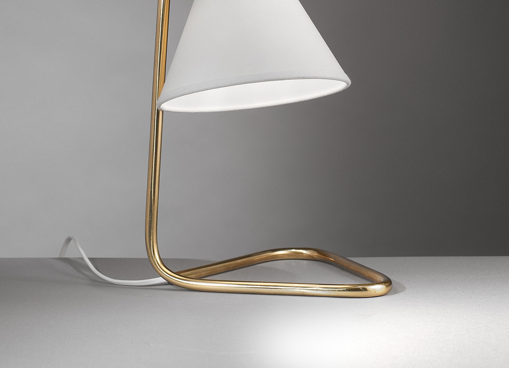 Lampe de Jean-Boris Lacroix.Laiton et tissu.Édition Robert Caillat, France, circa 1950.H. 35 cm, P. 21 cm.