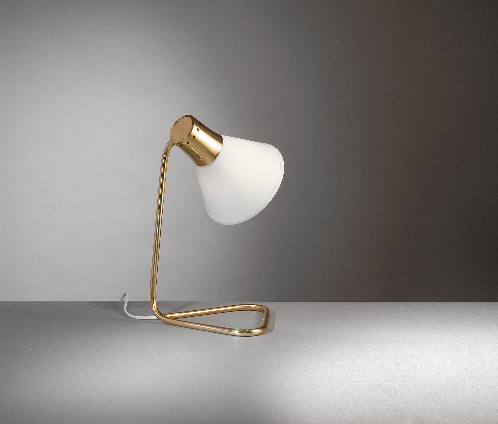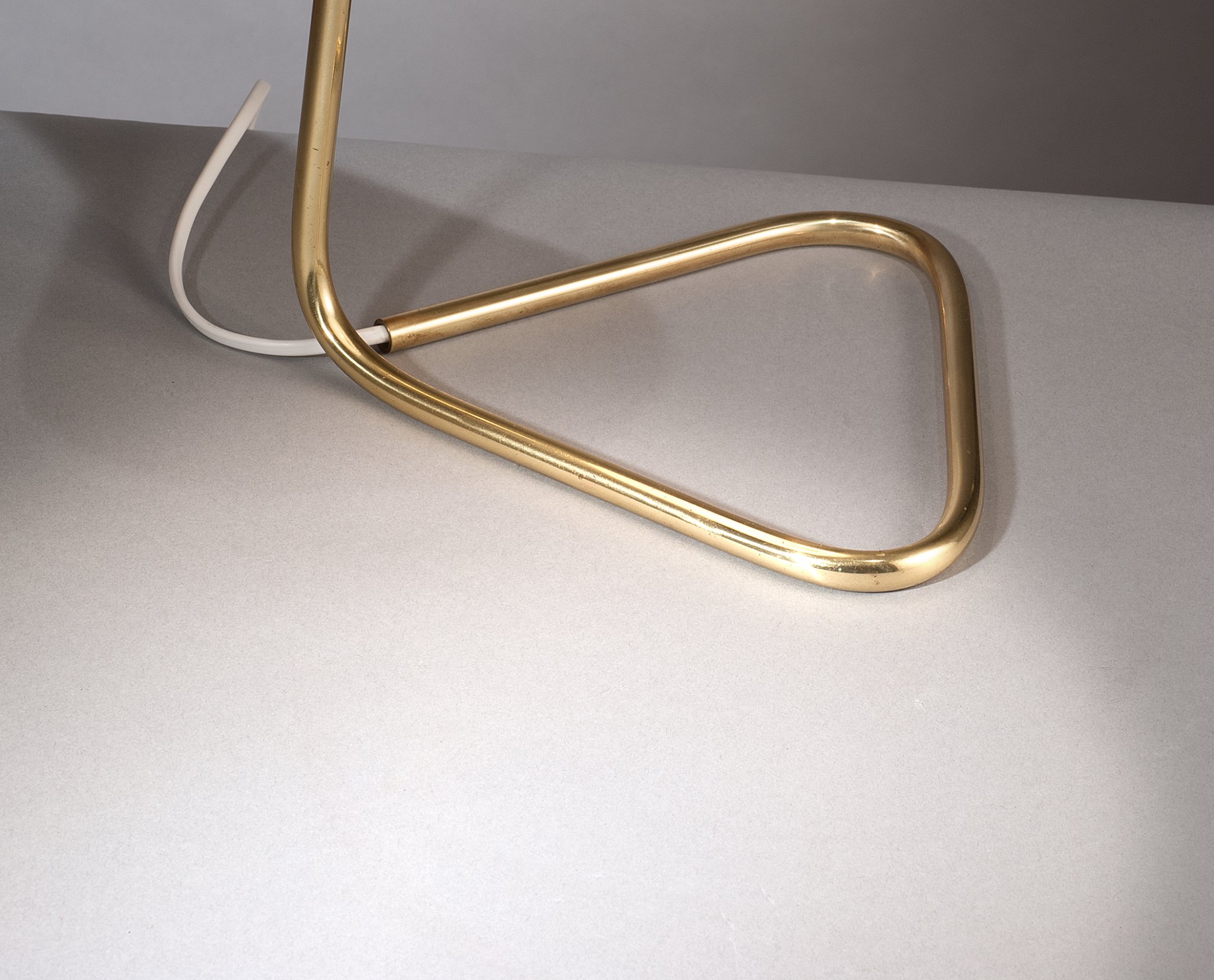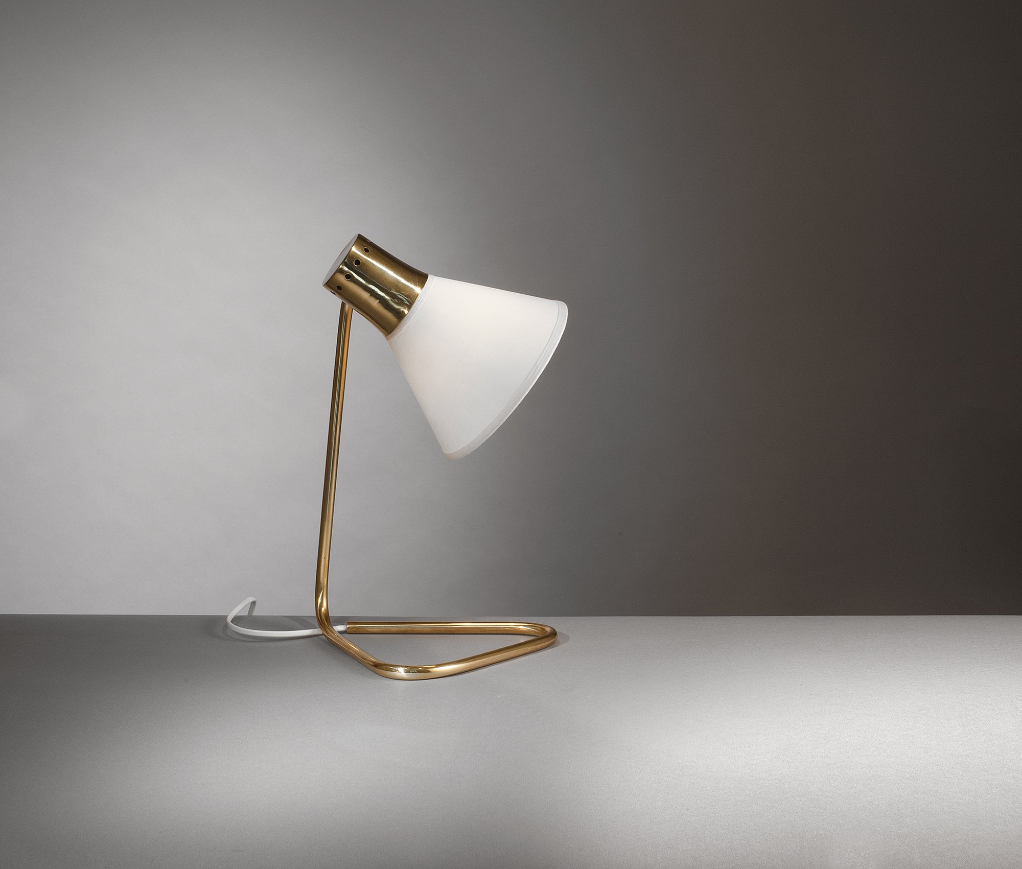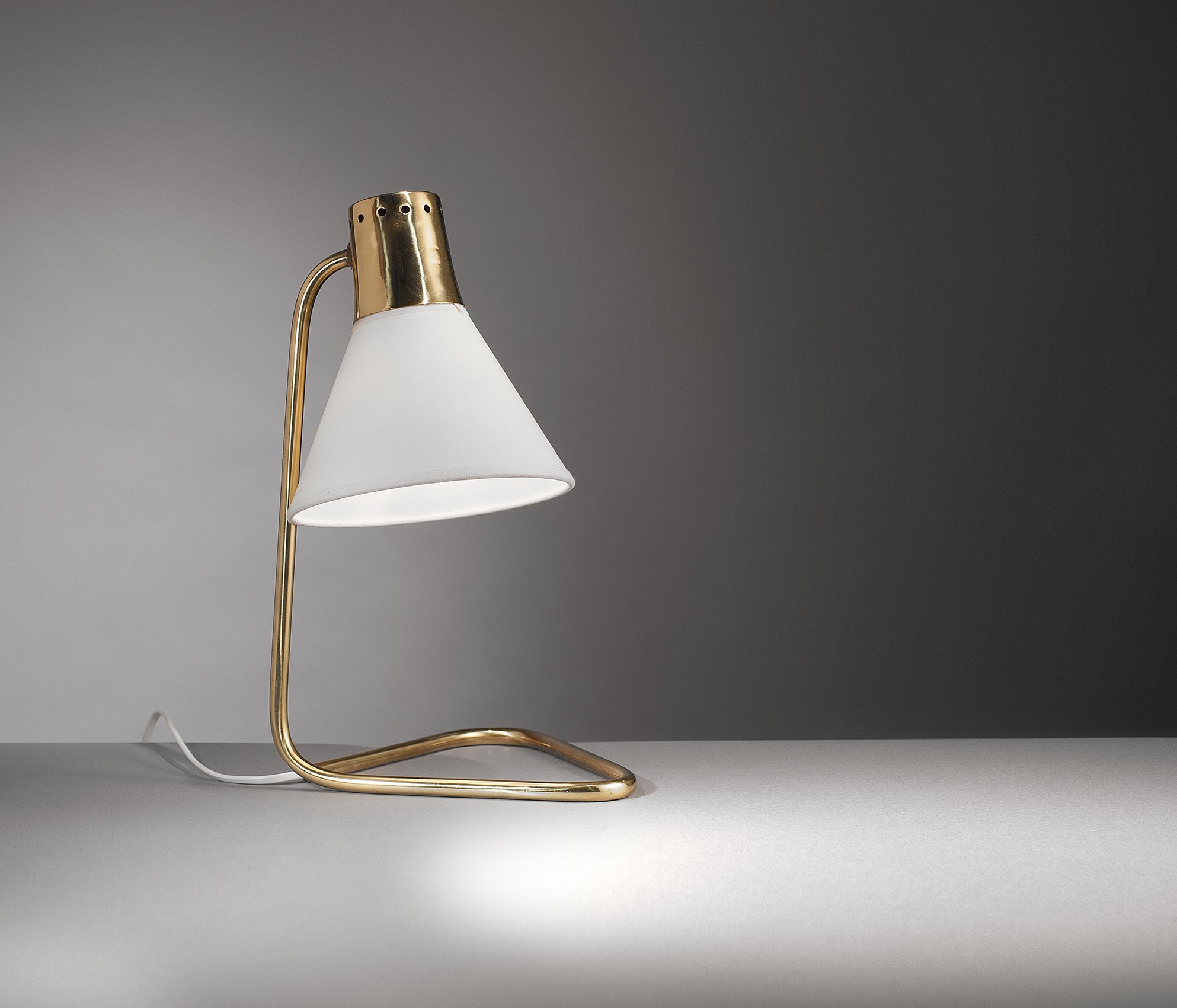 Lampe de Jean-Boris Lacroix.Laiton et tissu.Édition Robert Caillat, France, circa 1950.H. 35 cm, P. 21 cm.