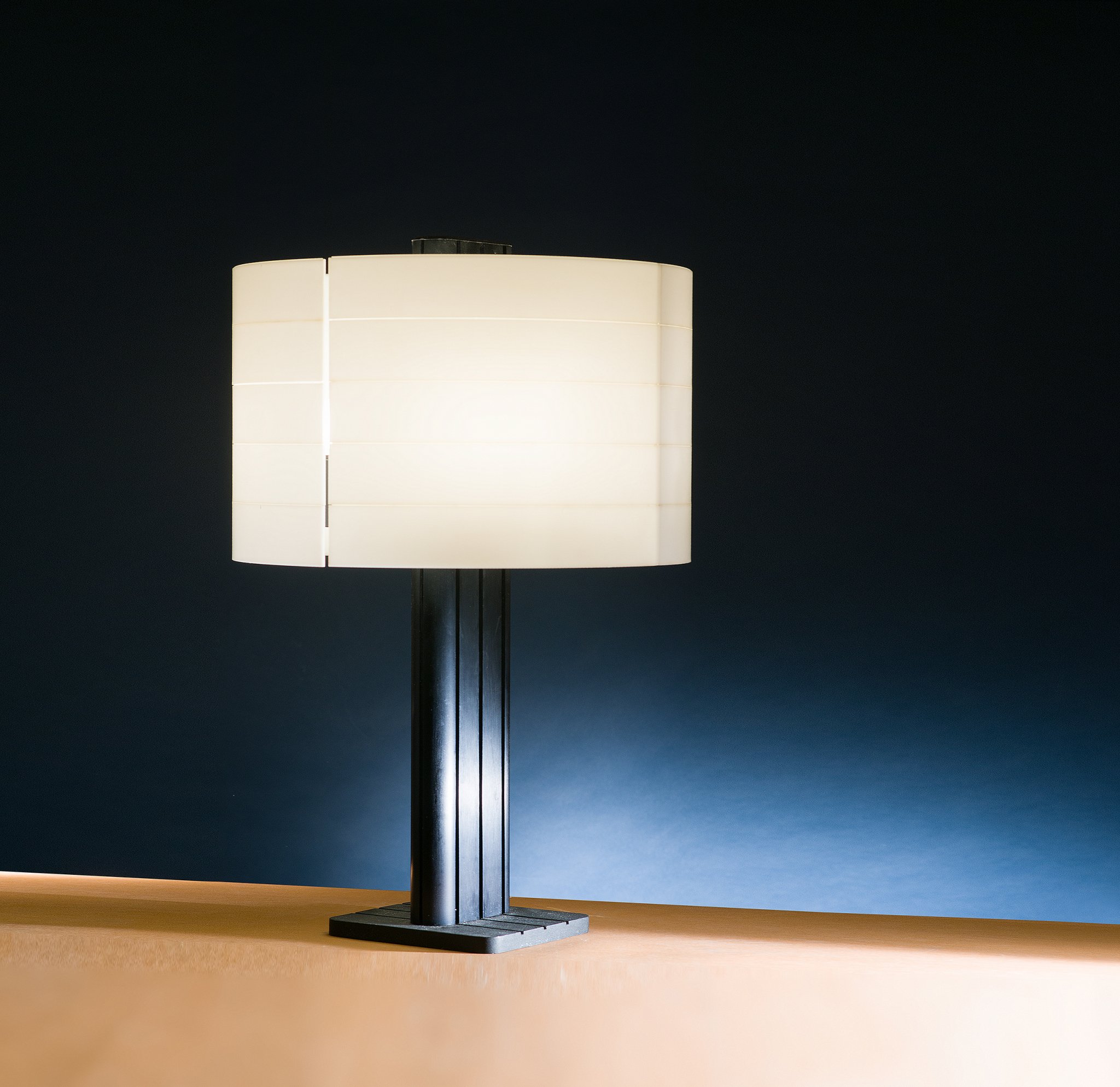 Base en fonte d’aluminium laquée noire, abat-jour en Méthacrylate.