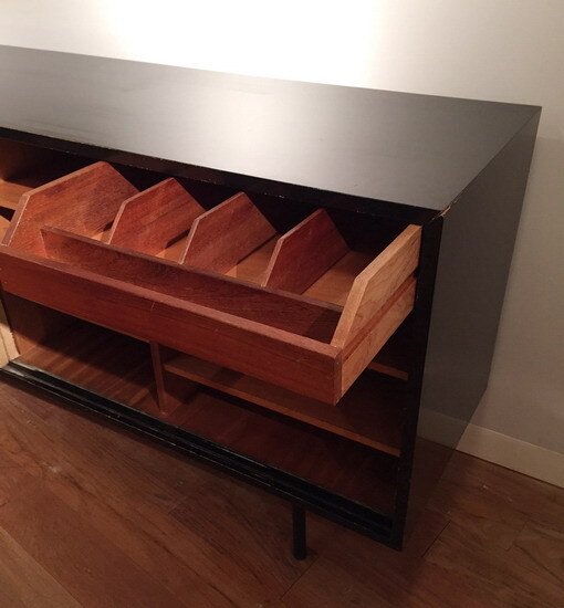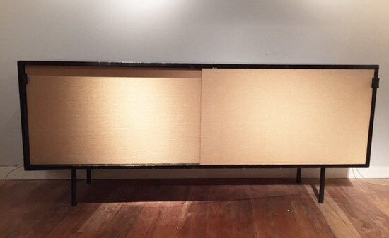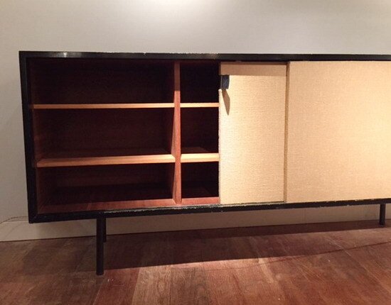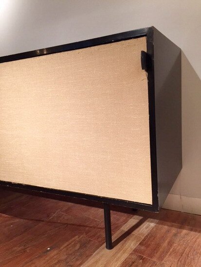 Bois, bois laqué, cuir, métal laqué et rafia.