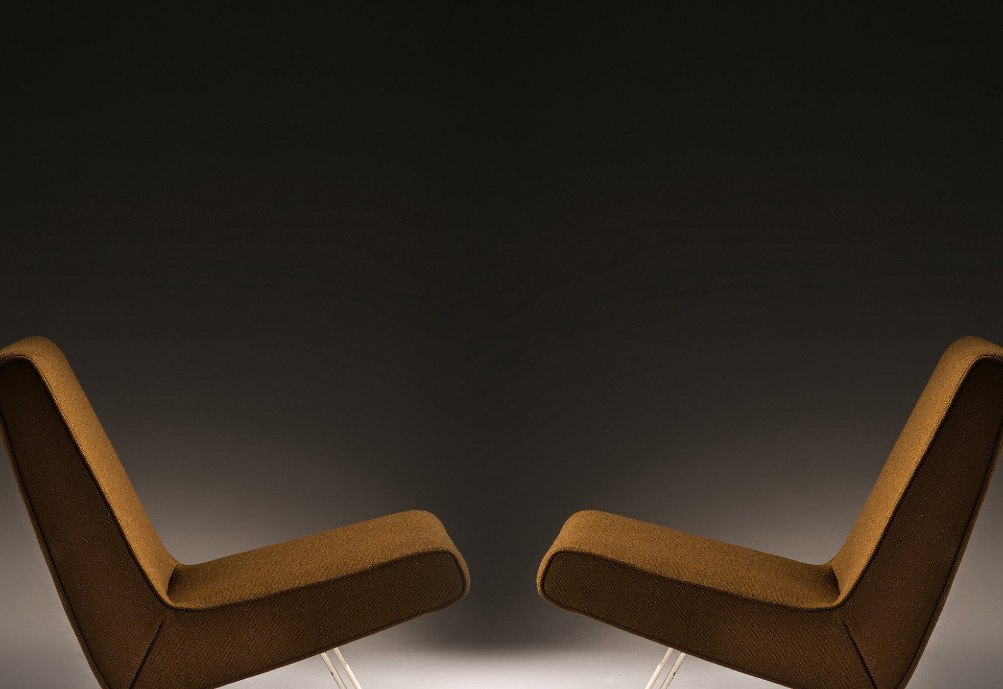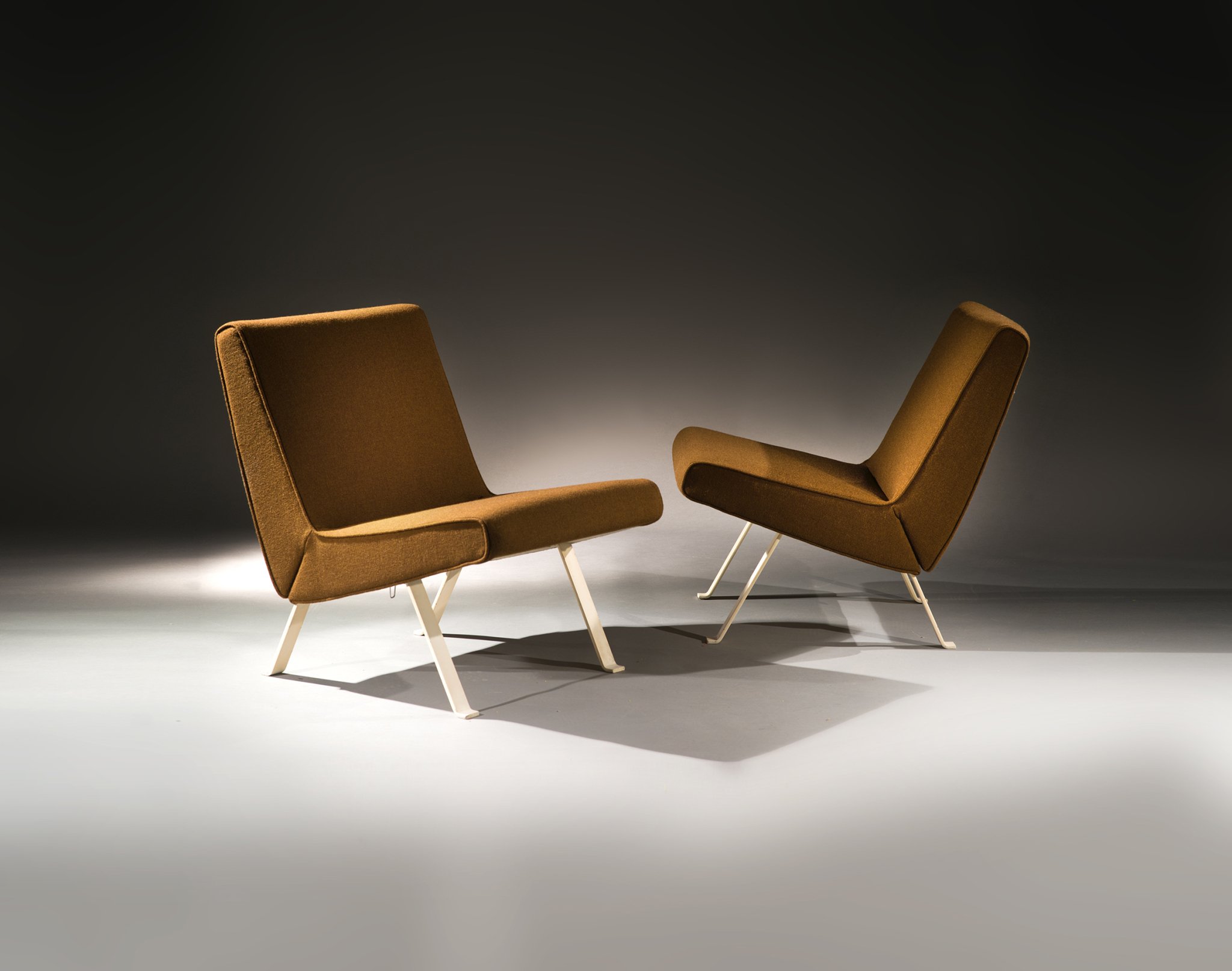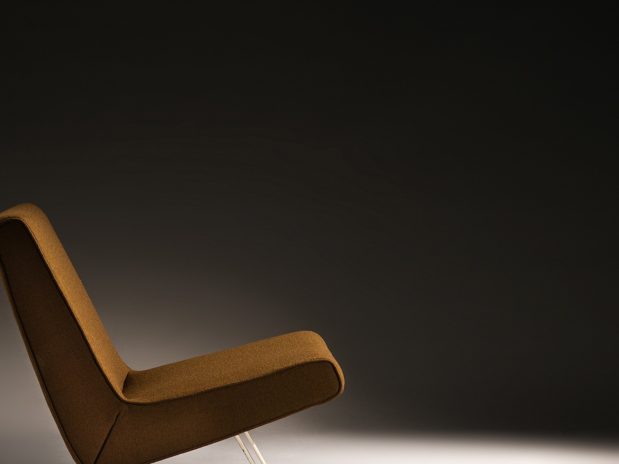 Métal laqué blanc, bois, mousse et tissu Kvadrat.