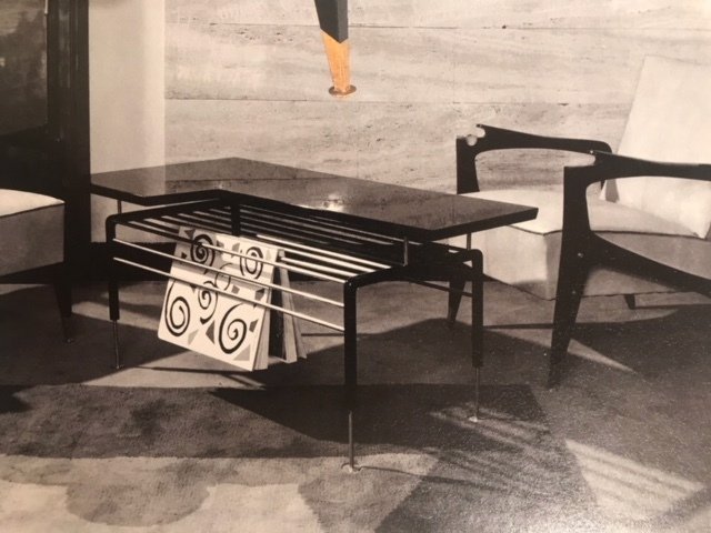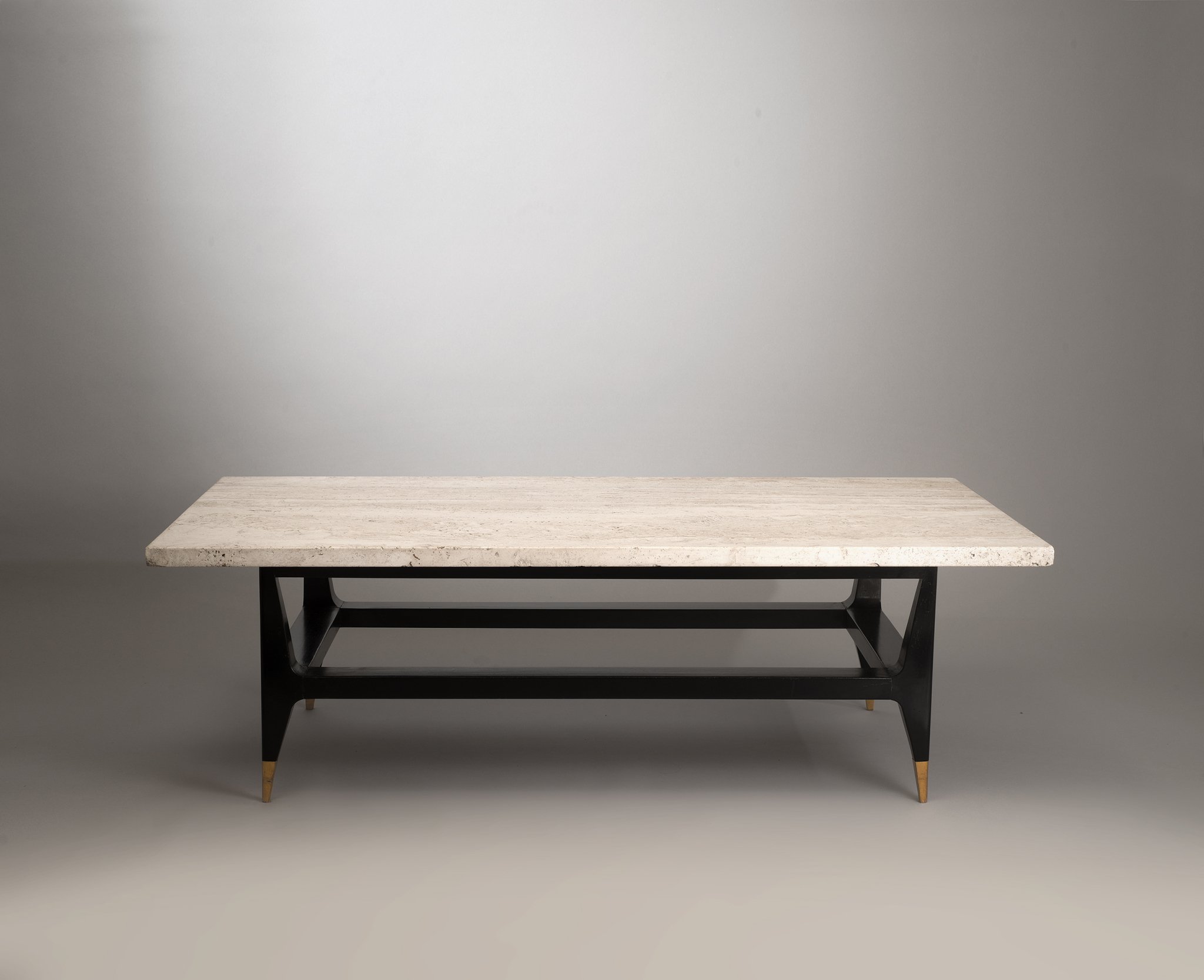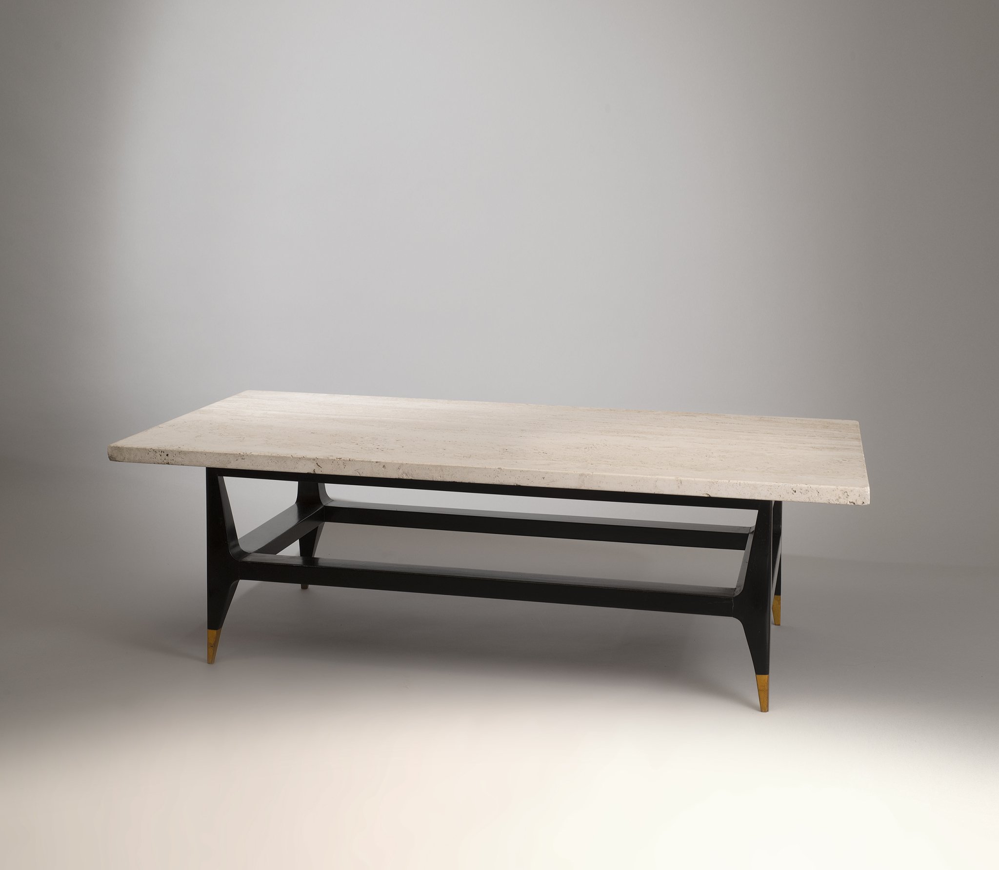 Table basse de Raphaël.Bois laqué, bronze et travertin.France, circa 1950.L. 130 cm, H. 43 cm, P. 70 cm.
