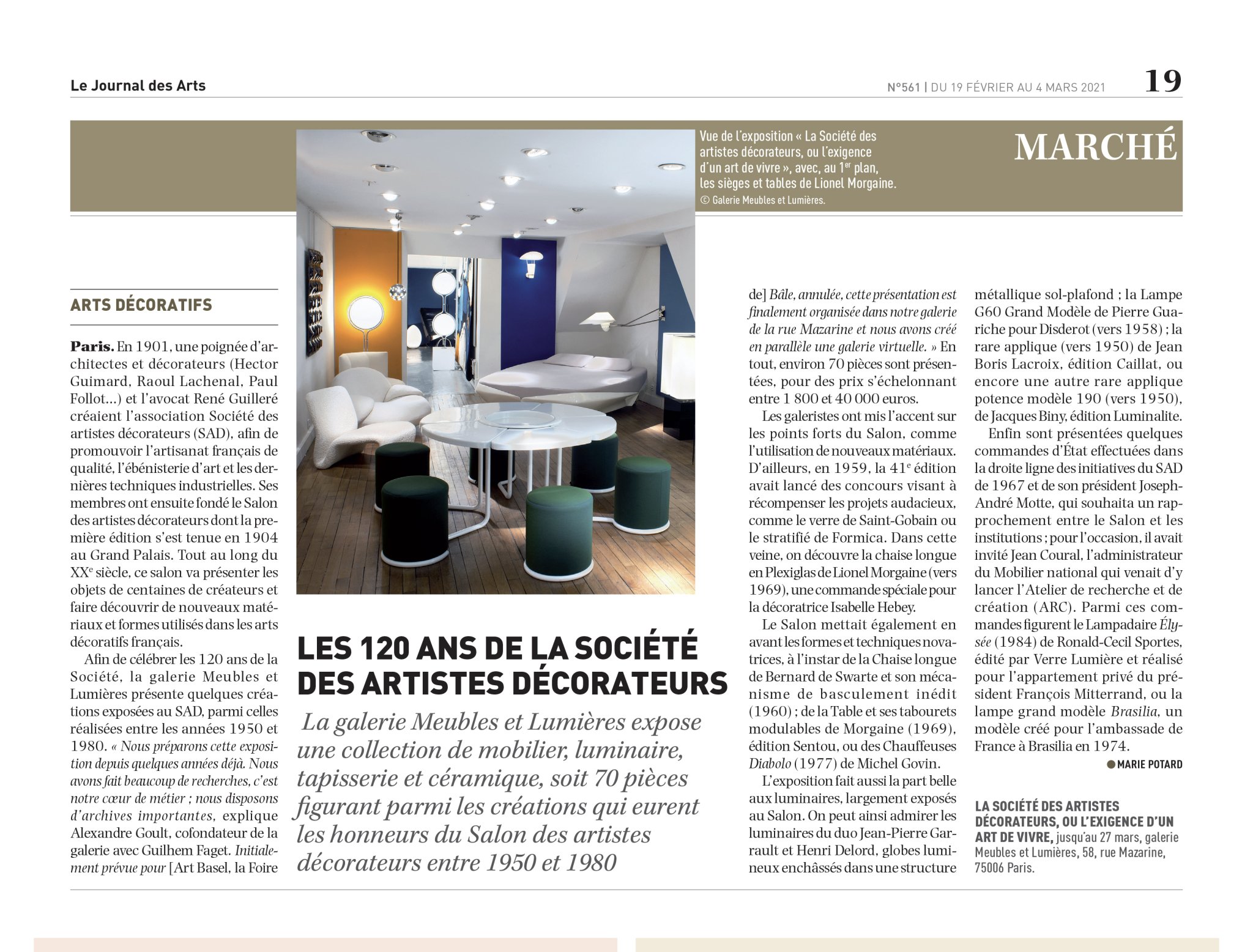 Afin de célébrer les 120 ans de la Société, la galerie Meubles et Lumières présente quelques créations exposées au SAD, parmi celles réalisées entre les années 1950 et 1980. « Nous préparons cette exposition depuis quelques années déjà. Nous avons fait beaucoup de recherches, c'est notre cœur de métier ; nous disposons d'archives importantes, explique Alexandre Goult, cofondateur de la galerie avec Guilhem Faget. Initialement prévue pour [Art Basel, la Foire de] Bâle, annulée, cette présentation est finalement organisée dans notre galerie de la rue Mazarine et nous avons créé en parallèle une galerie virtuelle. » En tout, environ 70 pièces sont présentées, pour des prix s'échelonnant entre 1 800 et 40 000 euros. Les galeristes ont mis l'accent sur les points forts du Salon, comme l'utilisation de nouveaux matériaux.