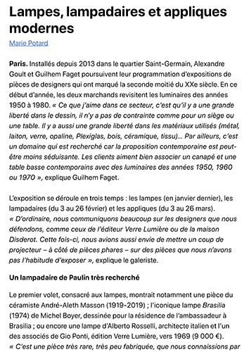 une table. Il y a aussi une grande liberté dans les matériaux utilisés (métal, laiton, verre, opaline, Plexiglas, bois, céramique, tissu)... Par ailleurs, c'est un domaine qui est recherche car la proposition contemporaine est peut-être  moins séduisante. Les clients aiment  bien associer un canapé et une table basse contemporaines avec des luminaires des années 1950, 1960 ou 1970 », explique Guilhem Faget.
