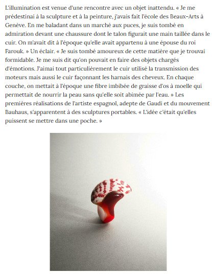 L'illumination est venue d'une rencontre avec un objet inattendu. « Je me prédestinai à la sculpture et à la peinture, j'avais fait l'école des Beaux-Arts à Genève. En me baladant dans un marché aux puces, je suis tombé en admiration devant une chaussure dont le talon figurait une main taillée dans le cuir. On m'avait dit à l'époque qu'elle avait appartenu à une épouse du roi Farouk. » Un éclair. « Je suis tombé amoureux de cette matière que je trouvai formidable. Je me suis dit qu'on pouvait en faire des objets chargés d'émotions. J'aimai tout particulièrement le cuir utilisé la transmission des moteurs mais aussi le cuir façonnant les harnais des cheveux. En chaque couche, on mettait à l'époque une fibre imbibée de graisse d'os à moelle qui permettait de nourrir la peau sans qu'elle soit abimée par l'eau. » Les premières réalisations de l'artiste espagnol, adepte de Gaudi et du mouvement Bauhaus, s'apparentent à des sculptures portables. « L'idée c'était qu'elles puissent se mettre dans une poche. »