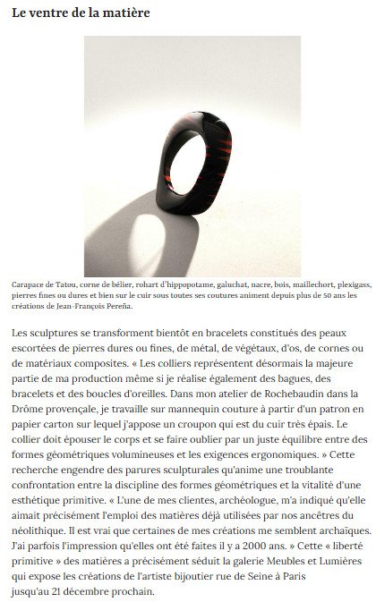Les joyaux de l’artiste bijoutier Jean-François Pereña sont mis en lumière à la Galerie Meubles et Lumières jusqu’au 21 décembre prochain. Un fascinant duel avec la matière.