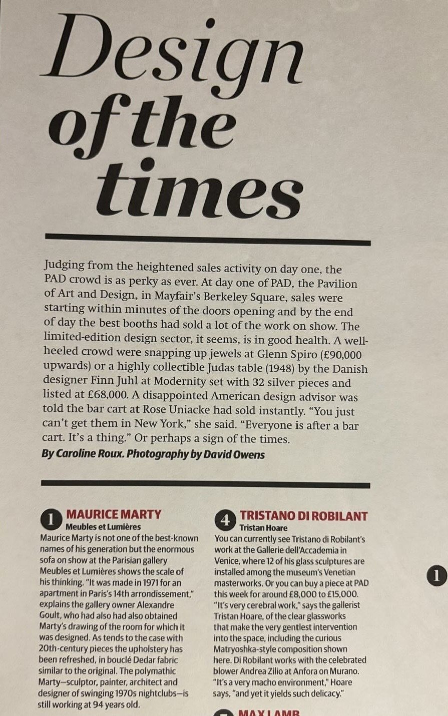 Judging from the heightened sales activity on day one, the PAD crowd is as perky as ever. At day one of PAD, the Pavilion of Art and Design, in Mayfair's Berkeley Square, sales were starting within minutes of the doors opening and by the end of day the best booths had sold a lot of the work on show. The limited-edition design sector, it seems, is in good health. A well-heeled crowd were snapping up jewels at Glenn Spiro (£90,000 upwards) or a highly collectible Judas table (1948) by the Danish designer Finn Juhl at Modernity set with 32 silver pieces and listed at £68,000. A disappointed American design advisor was told the bar cart at Rose Uniacke had sold instantly. "You just can't get them in New York," she said. "Everyone is after a bar cart. It's a thing." Or perhaps a sign of the times.