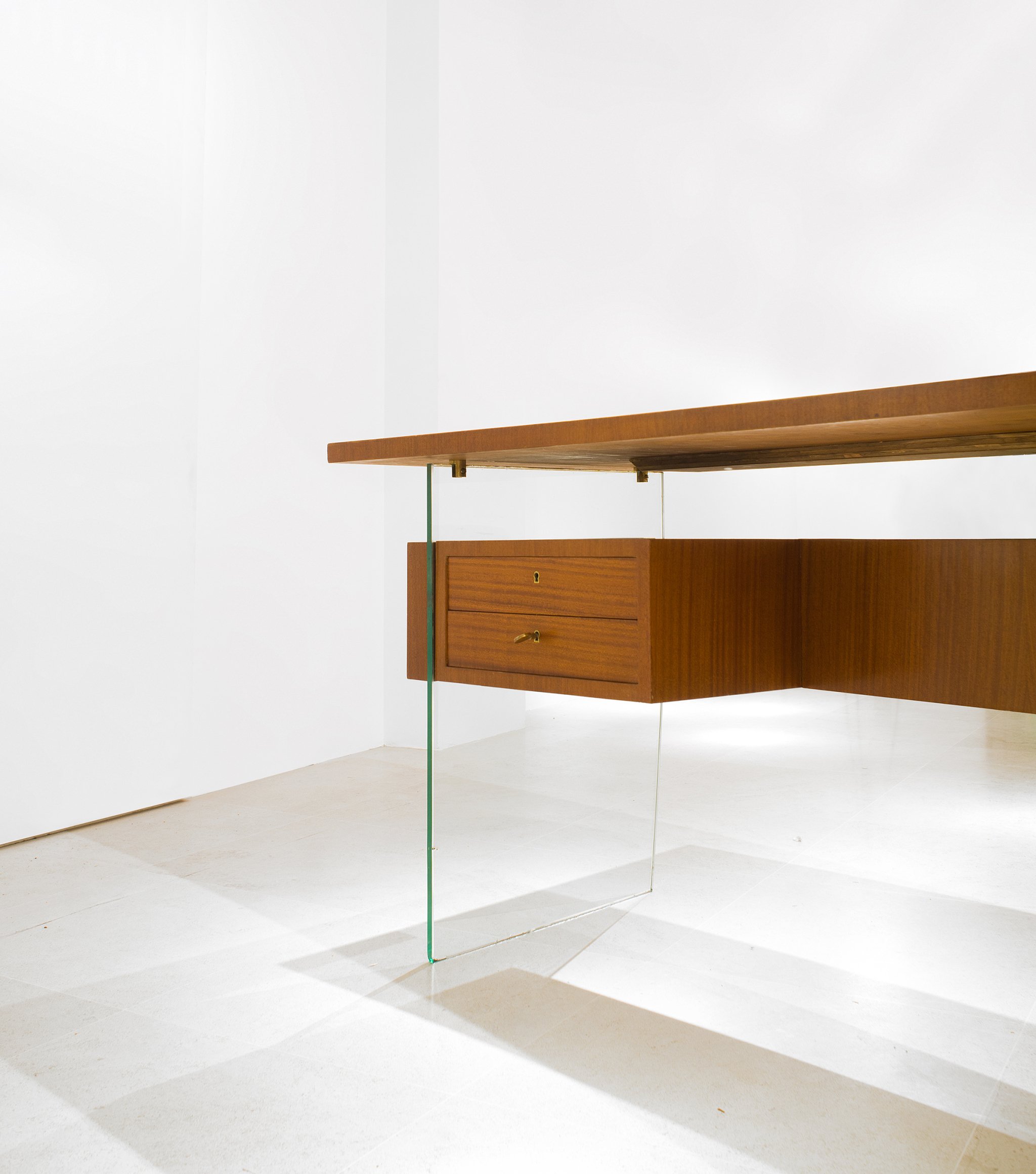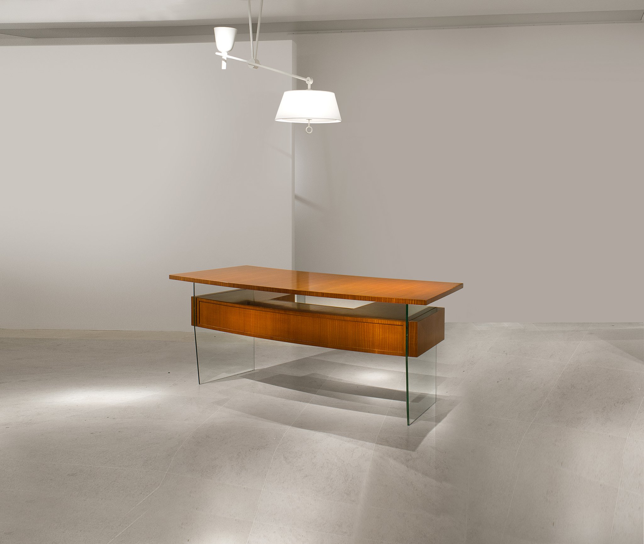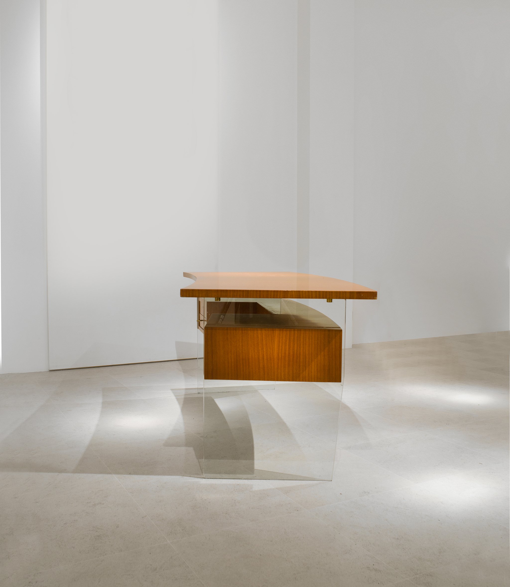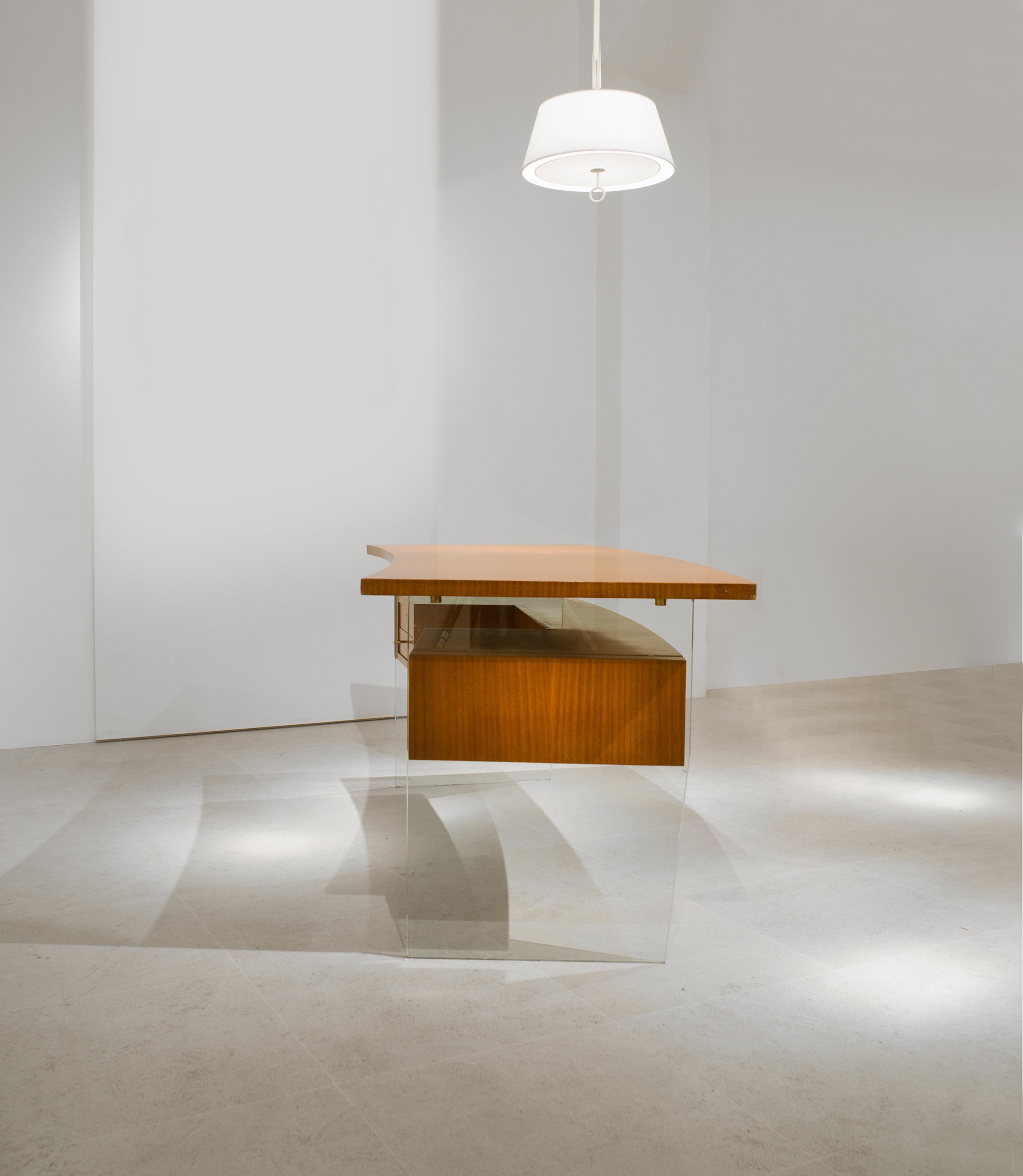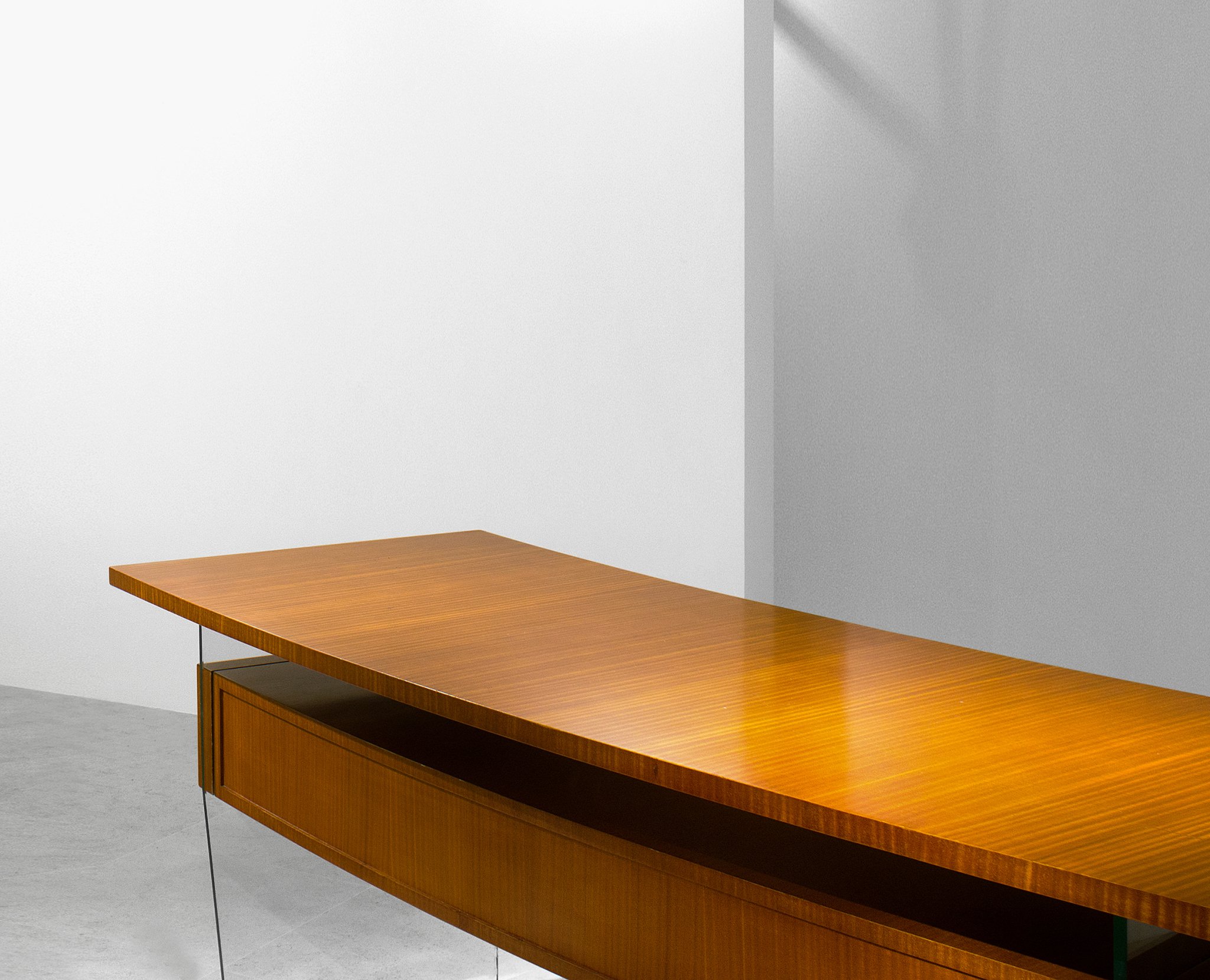 Curved desk attributed to Jacques DumondMahogany and securit glass France, c. 195OL. 190 cm, P. 70 cm, H. 75 cm
