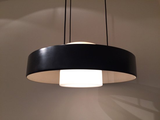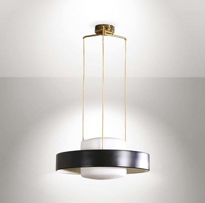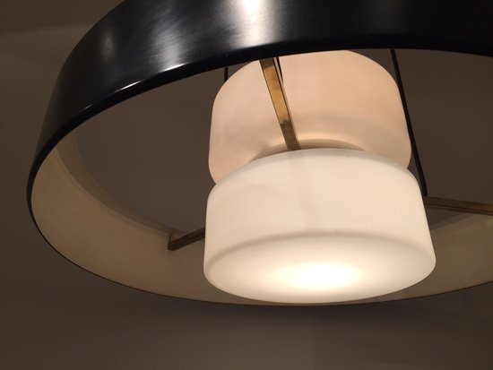 Ceiling light by Bruno Gatta.Brass, lacquered metal and opal glass.Edition Stilnovo, Italy, circa 1950.