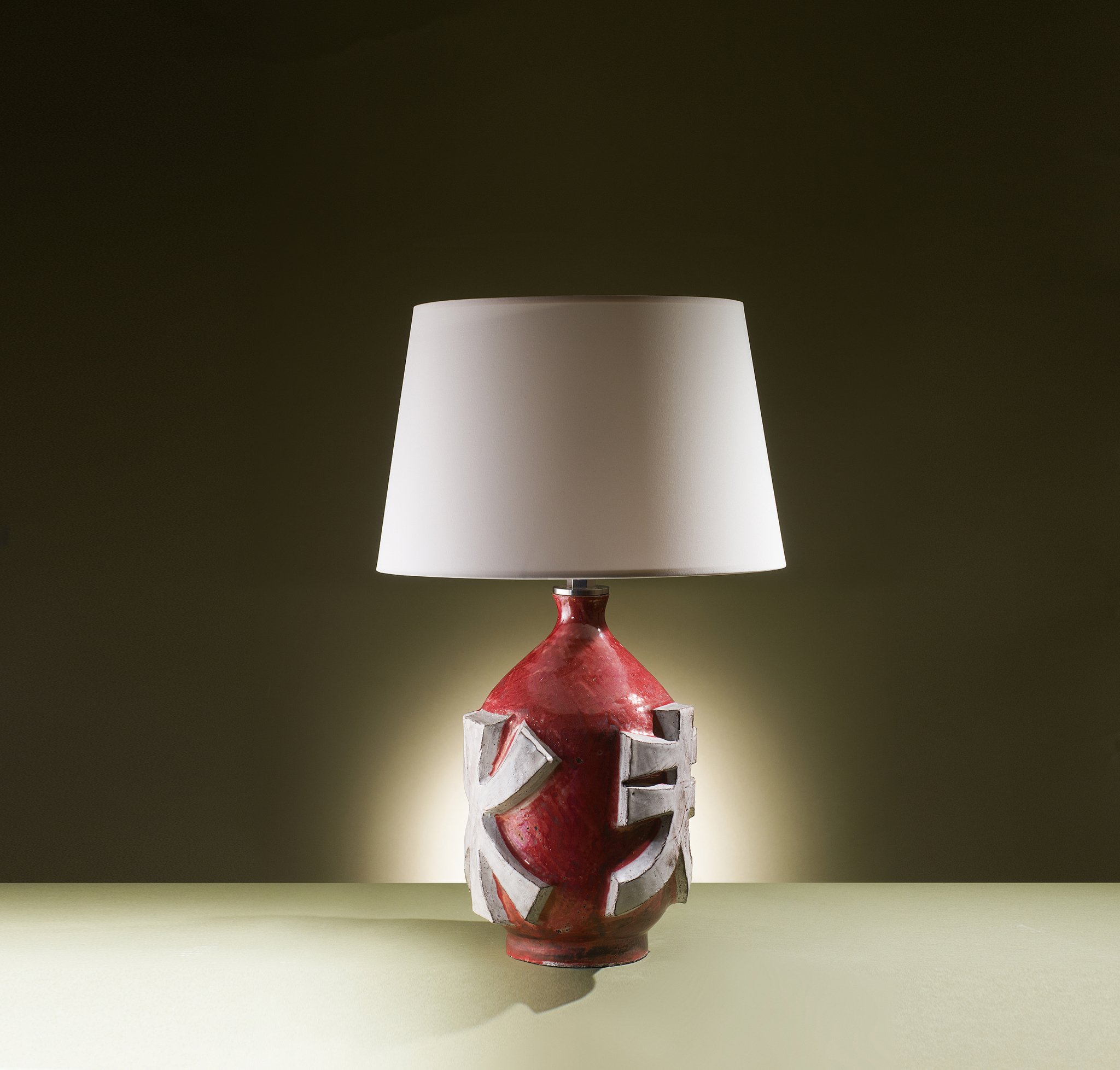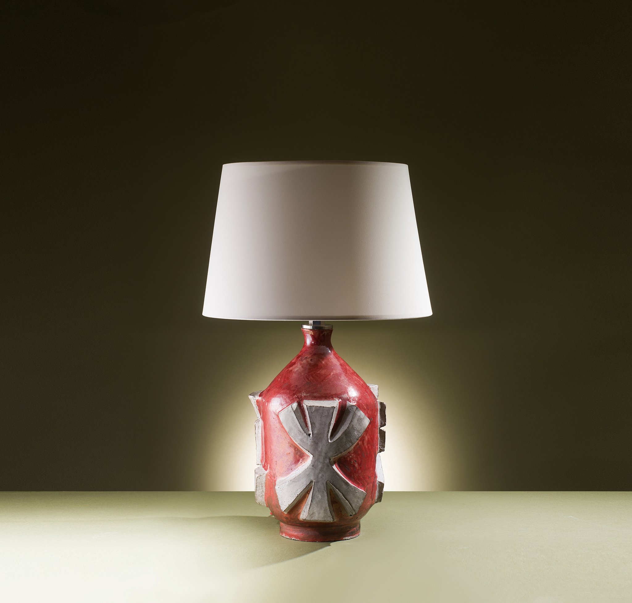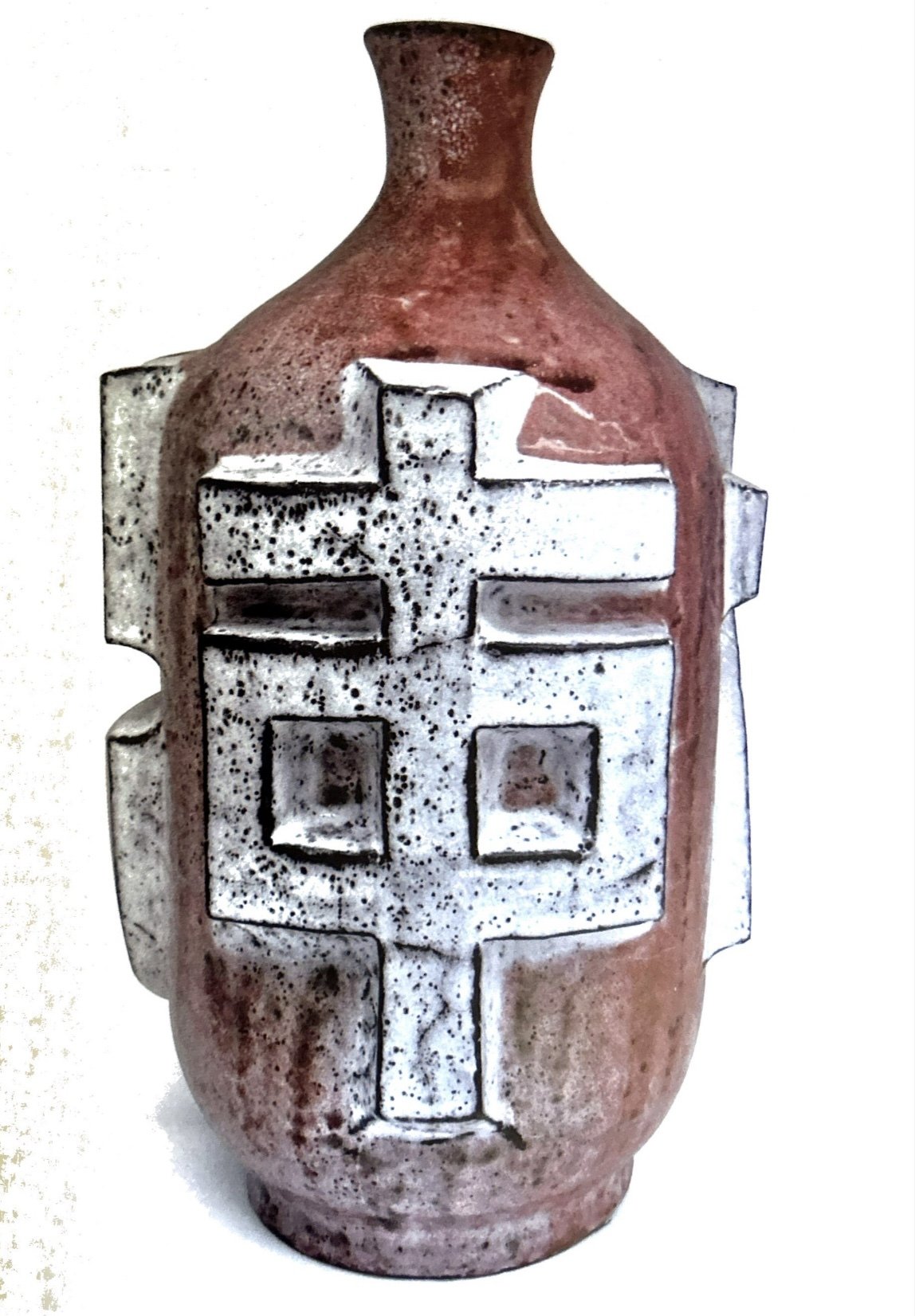 Chamotte clay, grey and brown enamels, copper red bacckground.