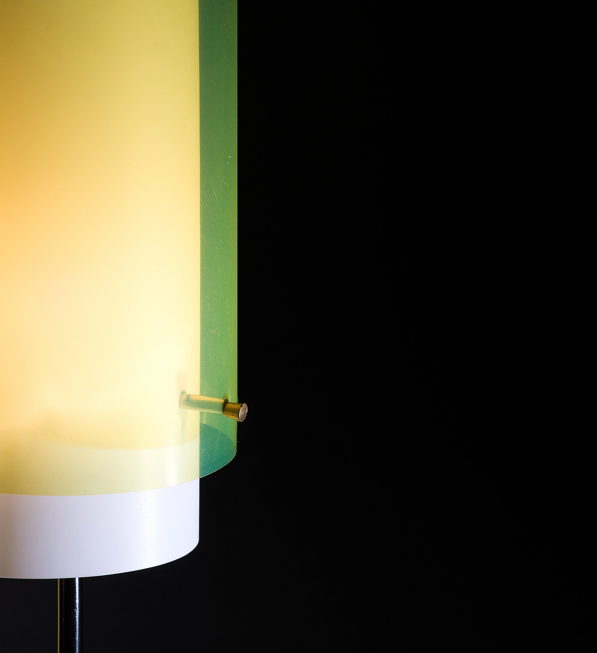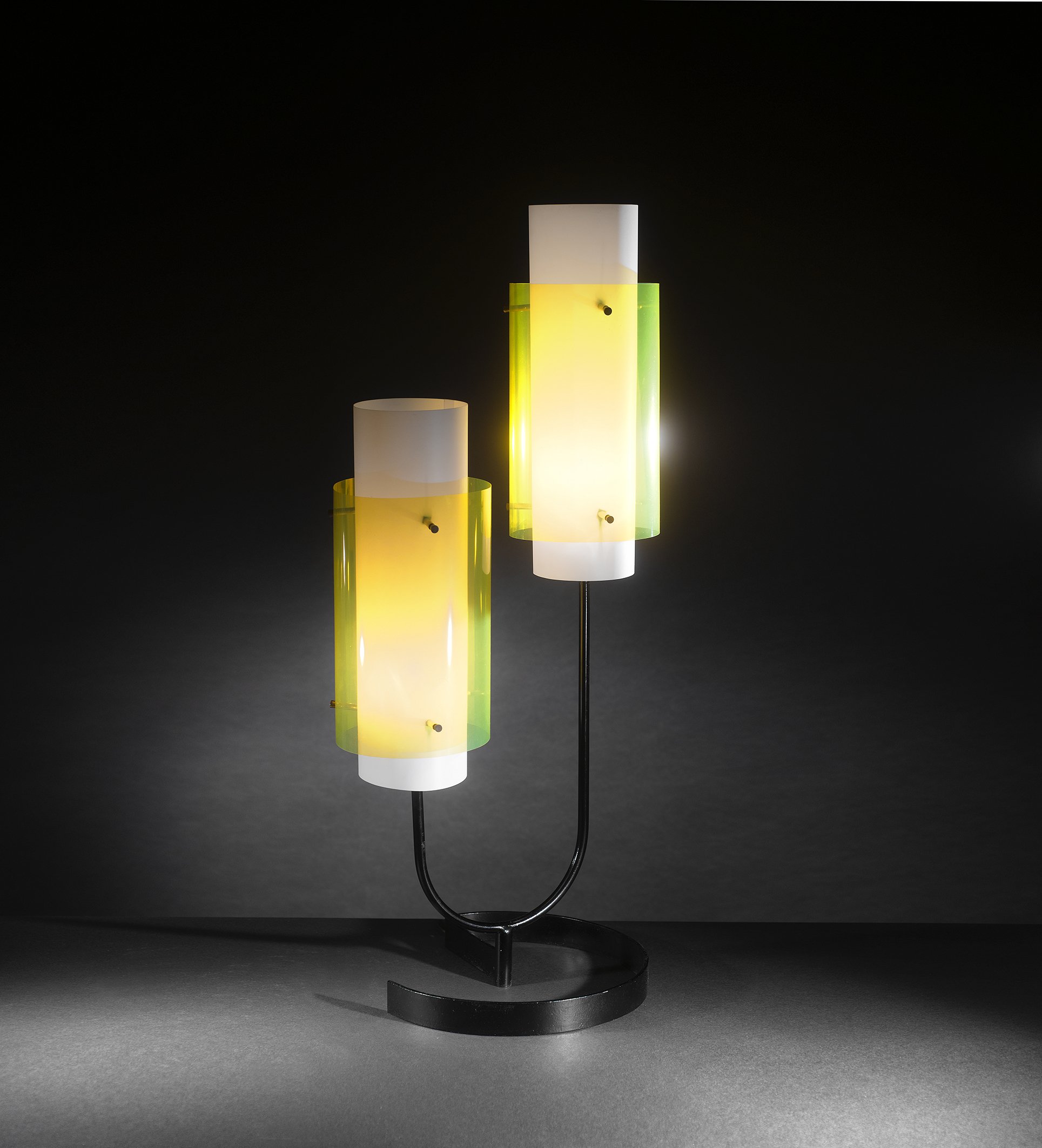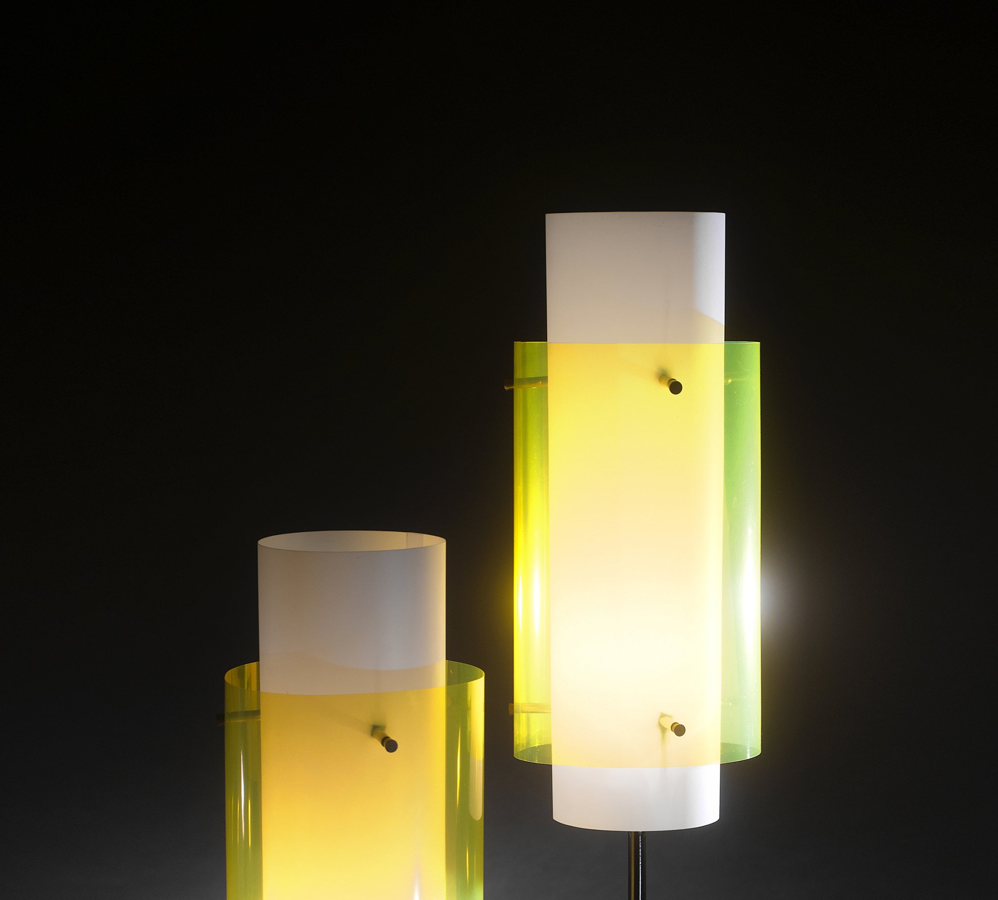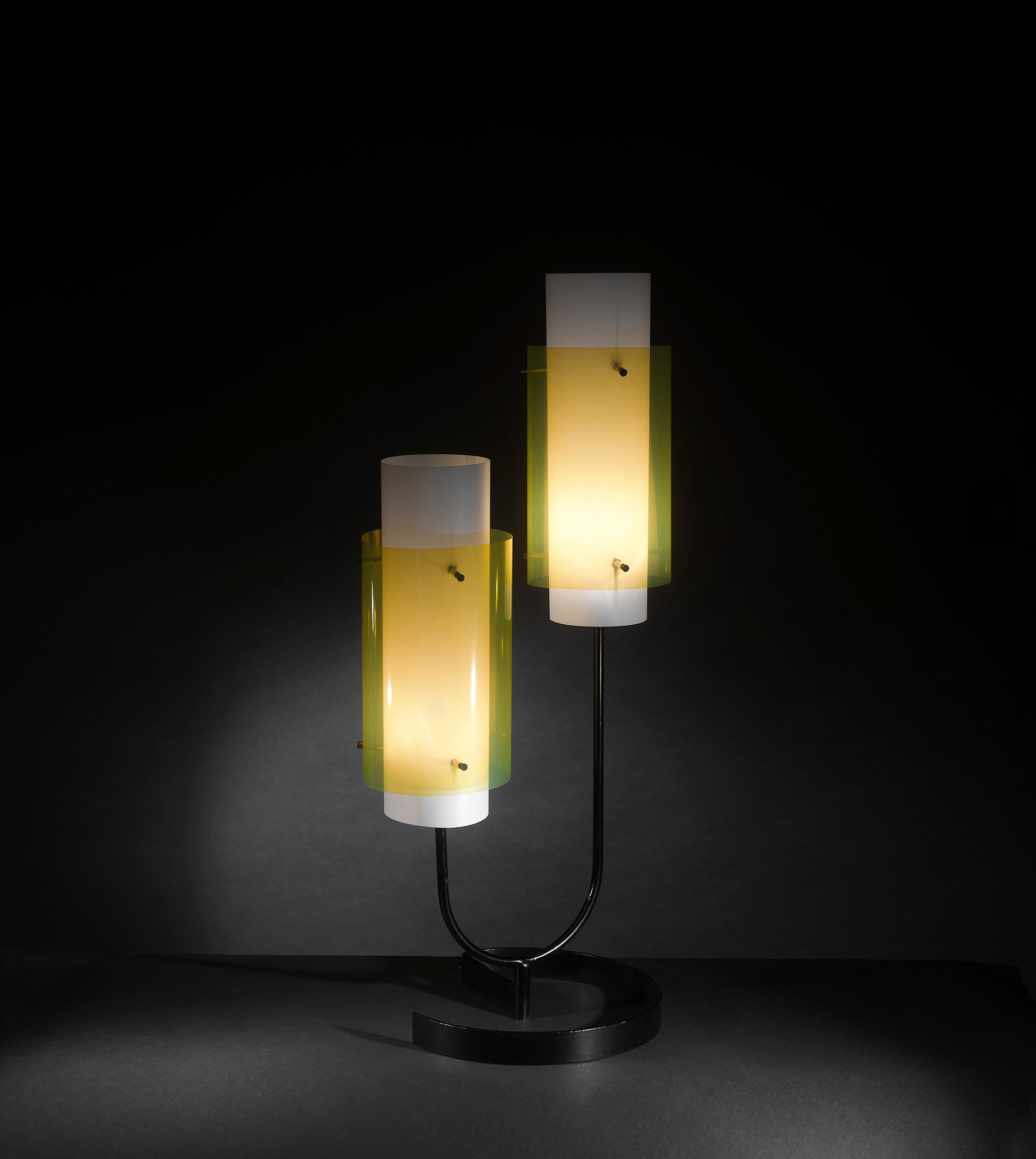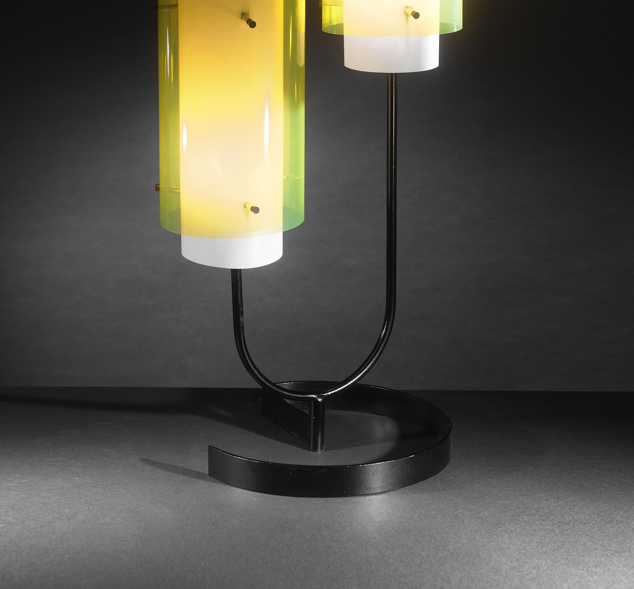 Lacquered metal, brass, methacrylate shades.