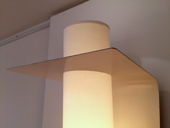 Brass, lacquered metal and fabric shade.