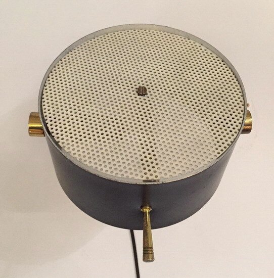 Brass, lacquered metal and sandblasted glass.