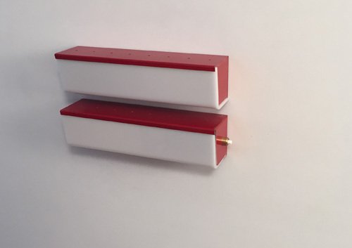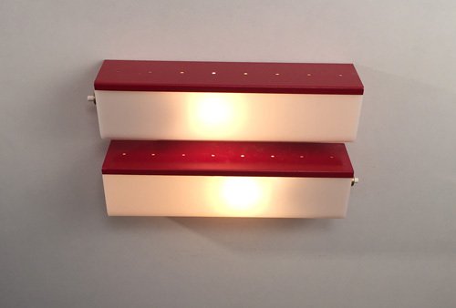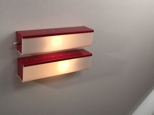Pair of red lacquered and perspex wall lights by Jacques Biny