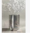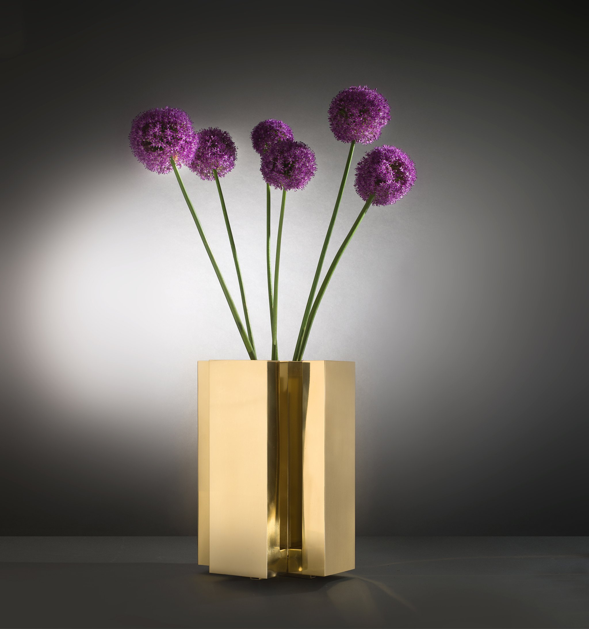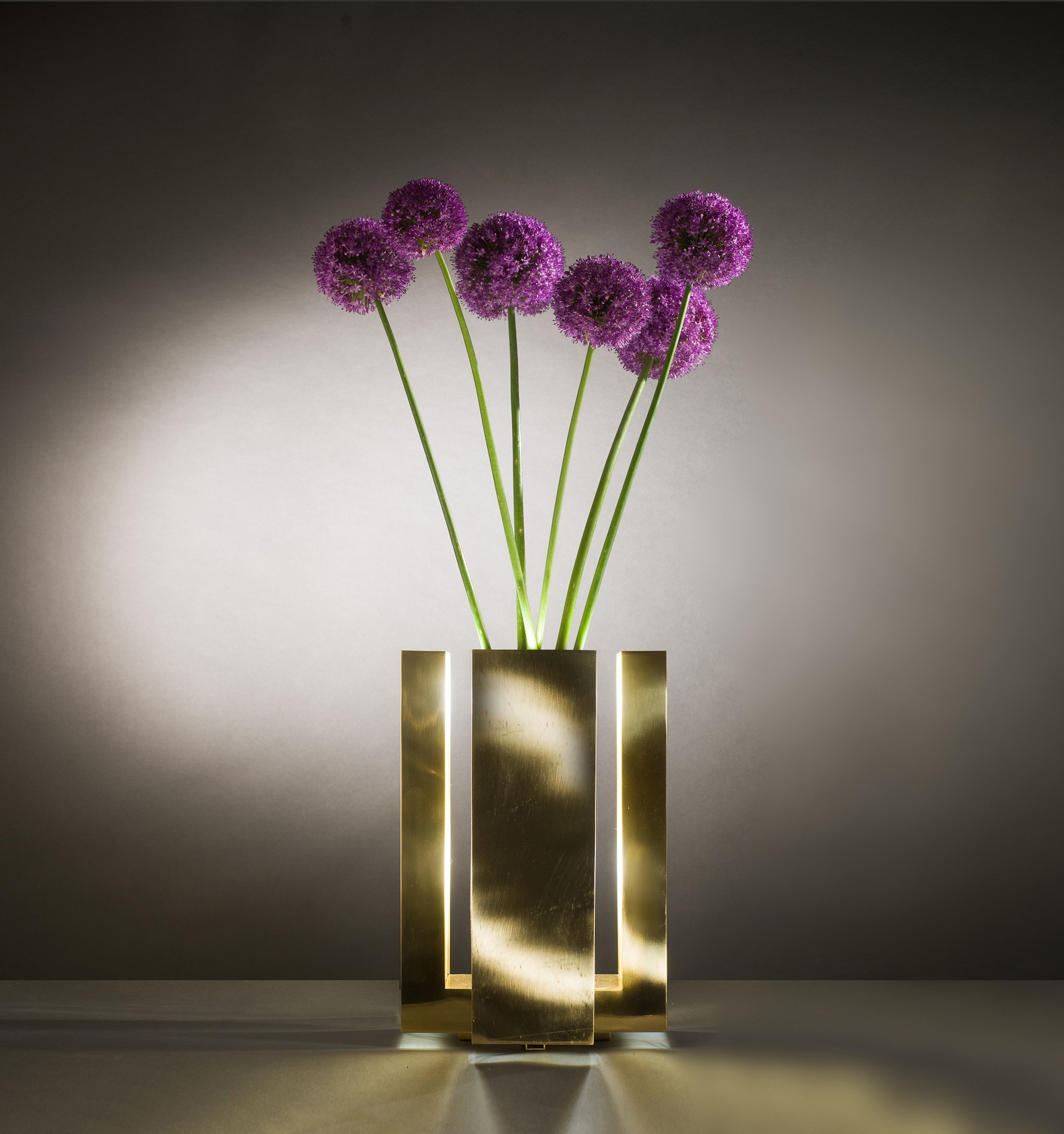 Polished brass, plexiglas. Composed of four light fixtures surrounding a vase.