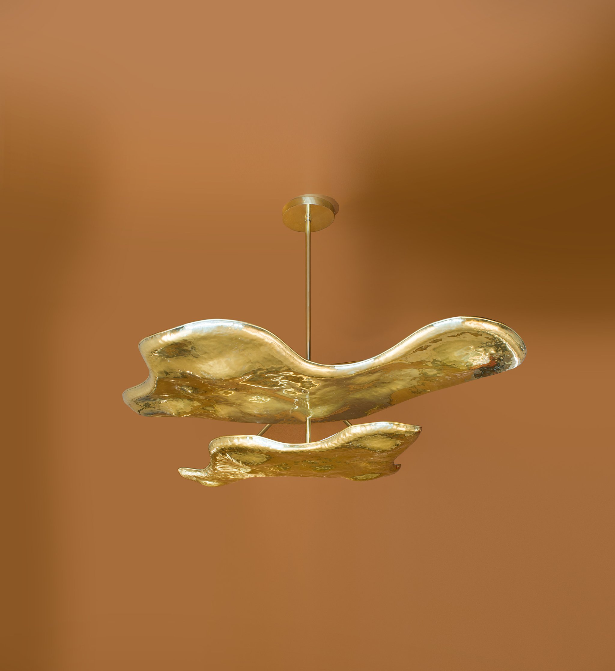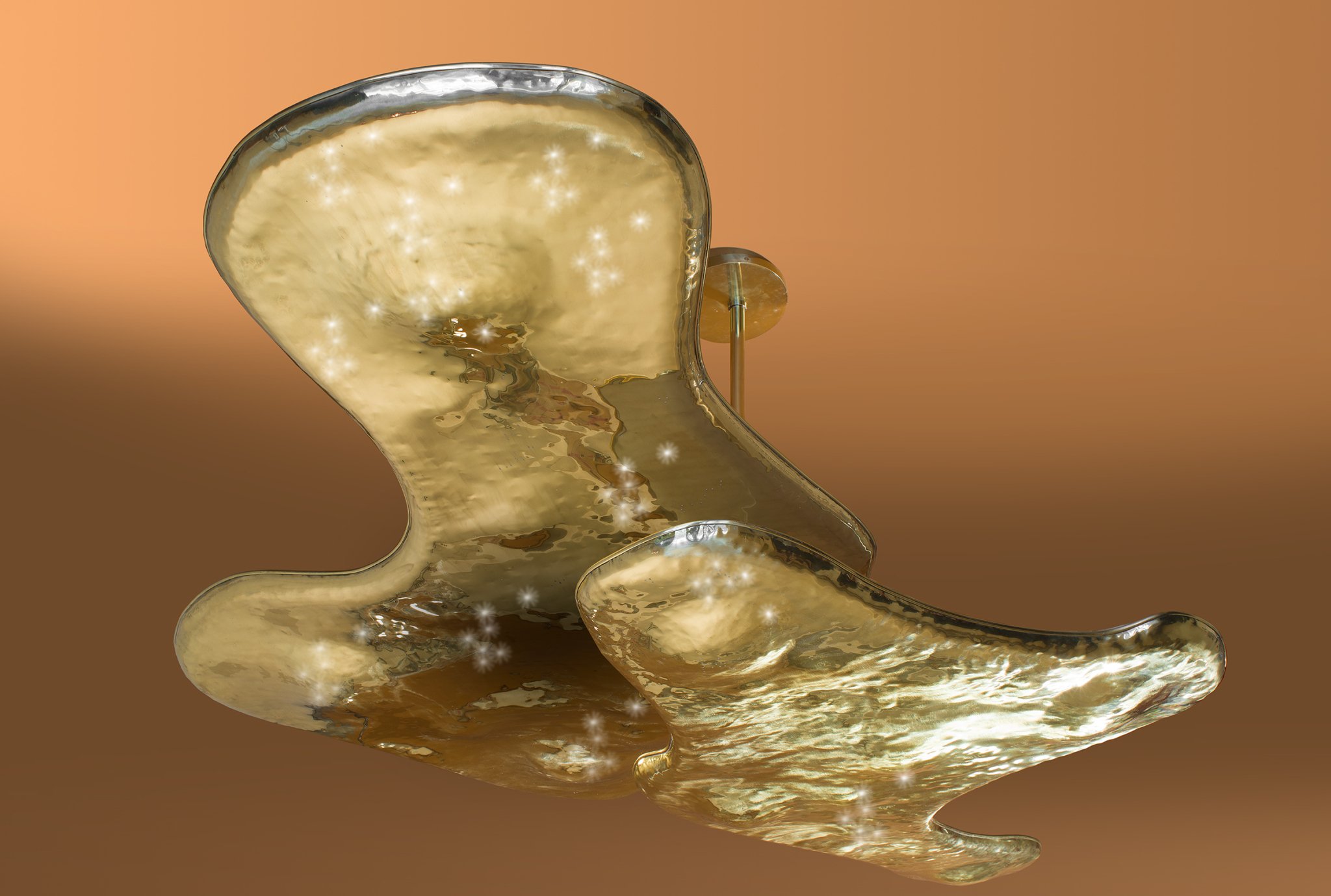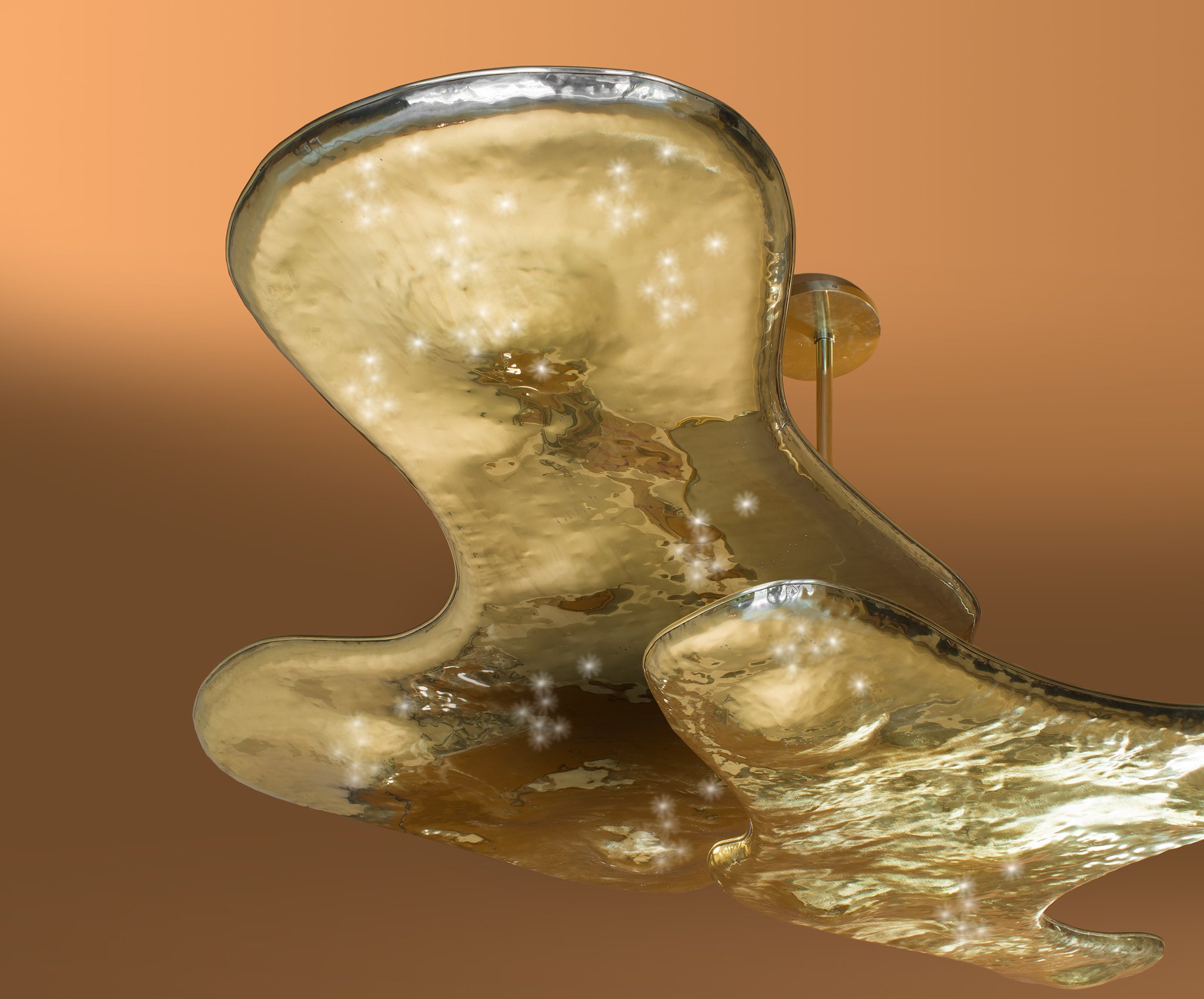 Hand sculpted and hammered brass, perforation, led lighting system.